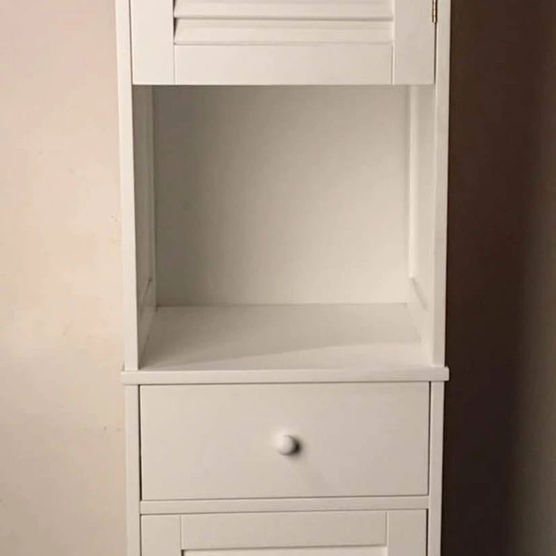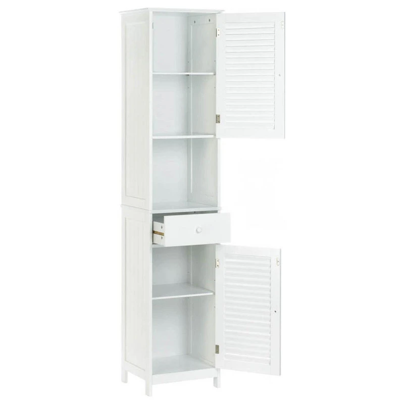 NANTUCKET BATH TALL CABINETWhen you are short on space but in need of more storage, this tall cabinet is the answer! It features two storage spaces with slatted doors to tuck away essentials, plus a pullout drawer and a display shelf.