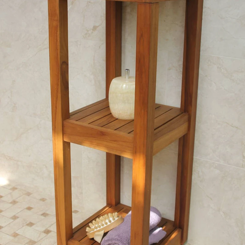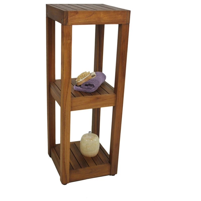 This beautiful AquaTeak® shelving unit is made with sustainably harvested teak wood that has no direct impact on the natural environment. You can use it as a teak shower stand or an accent shelf for any room! Naturally water resistant, this teak storage shelf can be used either indoors or outdoors. With three sturdy solid teak shelves, there is plenty of room for either storage or display, and the adjustable rubber padded feet provide safety and stability in any location. You will love the elegance and convenience of this teak shelving unit! We offer a 30 day satisfaction guarantee and 5 year warranty on all of our products. (Some assembly required)