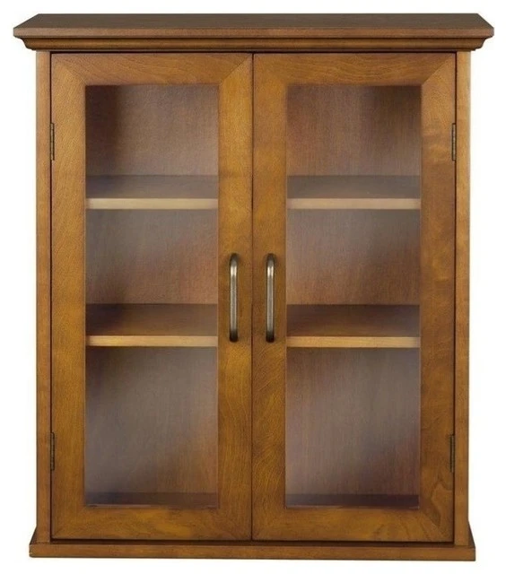 The Wall Cabinet with Two Doors features an oil oak finish with an elegant crown molded top offering storage with style for your bathroom. It is also very functional with two adjustable shelves. The tempered glass-paneled doors provides a clear view into the cabinet. It also features metal knobs for easy opening. This cabinet comes with assembly hardware.