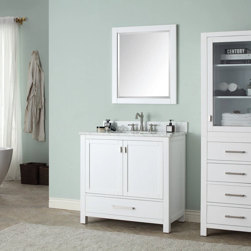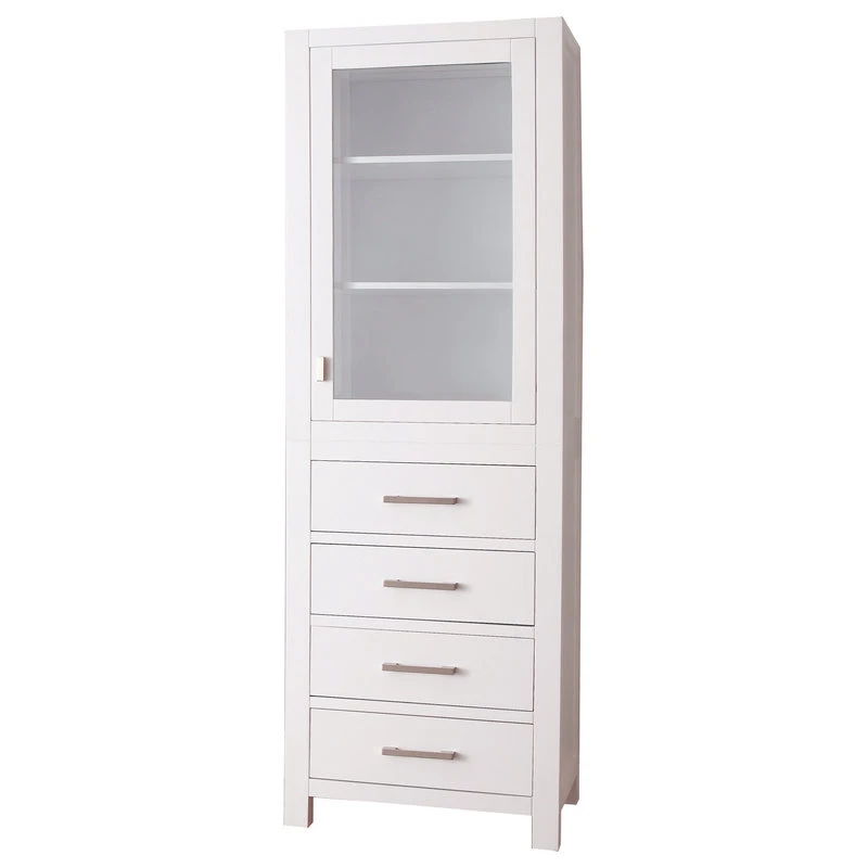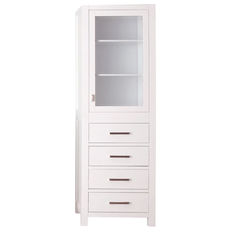 The Modero 24 in. linen tower has a simple clean design with a white finish and brushed nickel hardware. It is constructed of solid Poplar wood and veneer construction with soft-close doors and drawers that showcase its quality. The linen tower offers a clear glass door with interior shelves and soft-close drawers for storage.