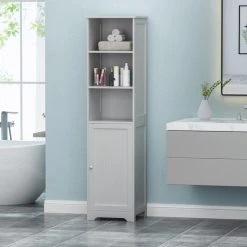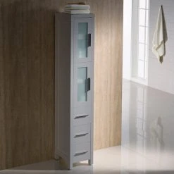 GDFStudio Lauren Modern Free Standing Bathroom Linen Tower Storage Cabinet, Light Gray