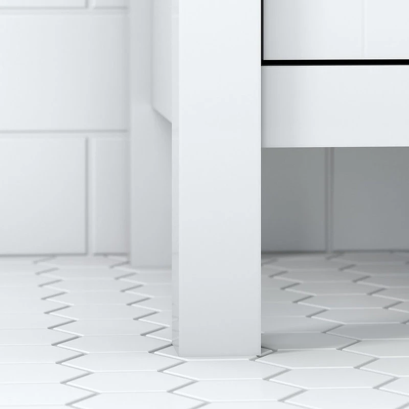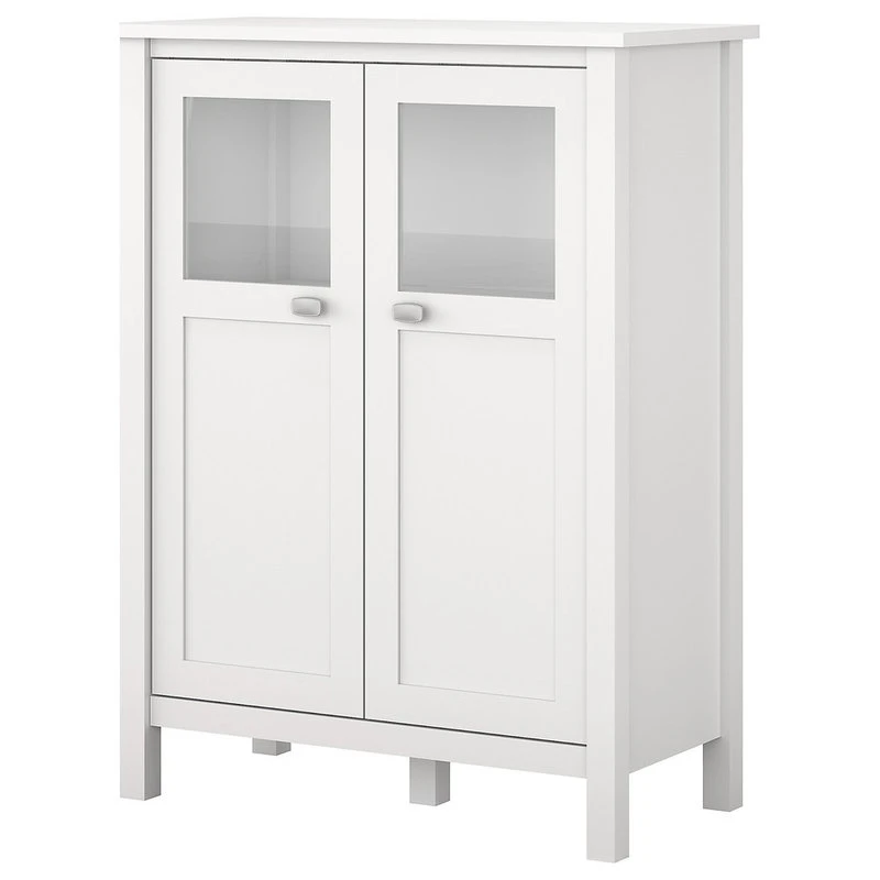 A traditional look with contemporary flair. Organize your everyday essentials with the Bush Furniture Broadview Bathroom Storage Cabinet. With a fashionable and functional design, the 2 door storage cabinet features glass accents and conceals 3 stationary and 4 adjustable shelves. Enjoy a smooth close as the doors feature self-closing Euro-style hinges. Elegant Satin Chrome hardware and a sturdy post leg design complete the beautiful Bathroom Cabinet, finished in White to complement any decor. Backed by a Bush Furniture 1 Year Manufacturer’s Warranty.Two glass accented doors enclose 3 stationary shelves and 4 adjustable shelves