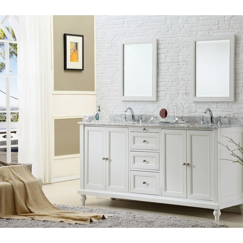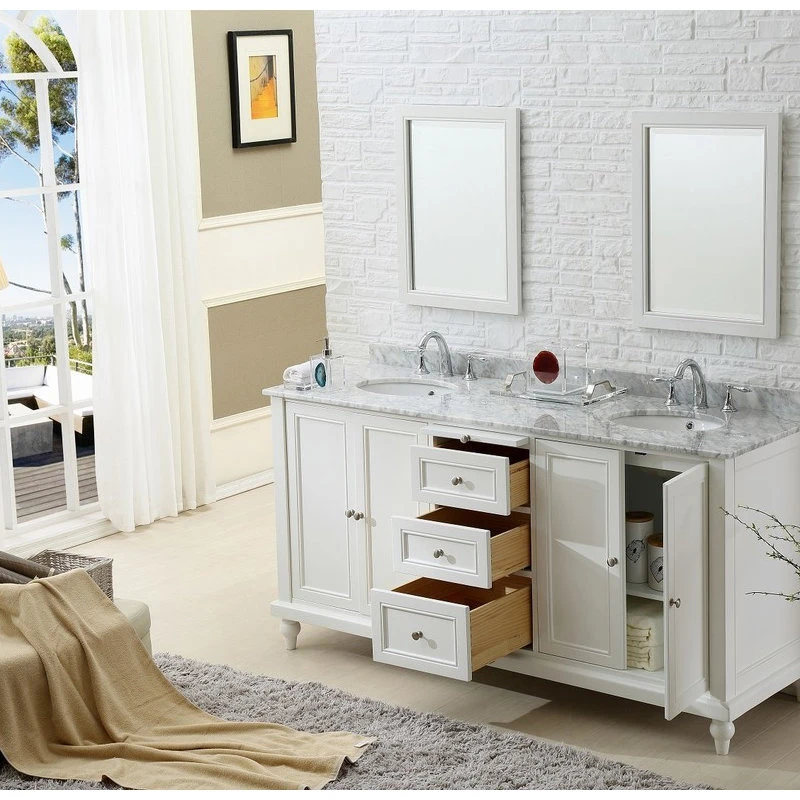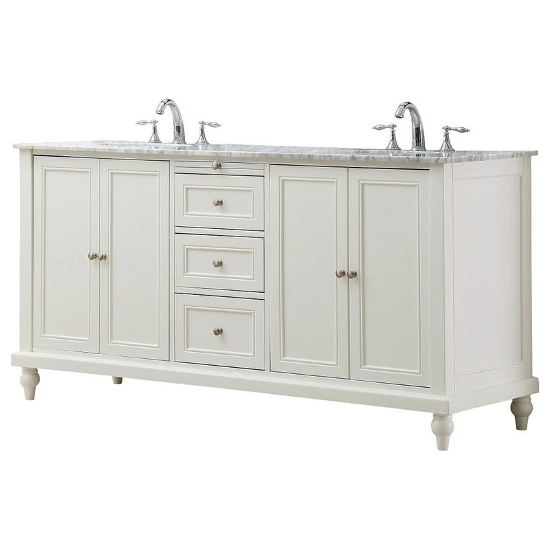 Complement your classic design with the Classic Double Vanity. This freestanding bath cabinet, with its flat-paneled door and drawer fronts, turned feet and round nickel hardware, is an ideal fit in traditional, transitional or even coastal-inspired spaces. It features a smooth, white finish that pairs beautifully with a Carrara marble top, and is equipped with ample storage to keep your washroom neat and orderly and the focus on your timeless style.
