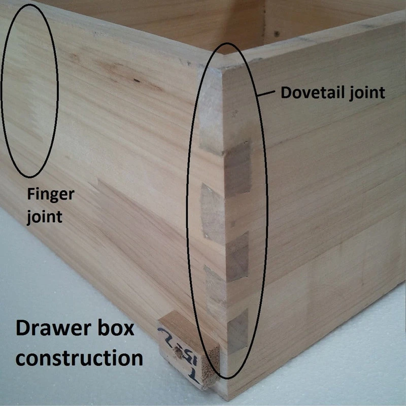 - Dovetail drawer joinery and finger-joined paneling