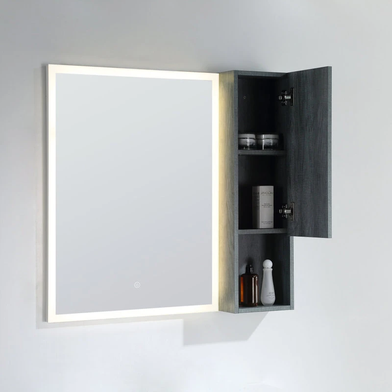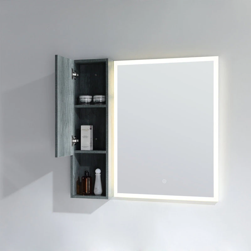 Wall-mounted laminated wood side cabinet with 3 shelves (2 enclosed, 1 open) and one soft close door that can be adjusted to open to the left or right. Works as standalone cabinet or can be paired with a wall mirror, typically above a vanity set. Available in off-white, tan, black, bluish-green, walnut , and cement grey
