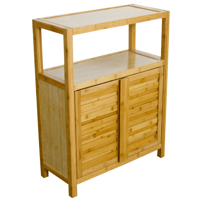 The Eccostyle sustainable bamboo spa style 2 door utility cabinet has a water-resistant finish and non-scuff footpads making it a perfect fit for wet environments. With two exterior shelves and a dust-free cabinet with an adjustable interior shelf, there is ample space for your towels, tissue, shampoo, and spa accessories. You can trust that the sturdy, eco-friendly bamboo construction makes it desirable for a variety of uses, without the worry of water absorption or bacterial build-up. The ideal design and versatility for your shower, entryway, boudoir, or use as a stationary serving cabinet. Prop 65 Required: Yes Formaldehyde. Warning: This Product Can expose you to chemicals including formaldehyde, Which are known to the state of California to cause cancer or birth defects or other reproductive harm. For more information go to WWW.P65warnings.ca.gov/furniture.