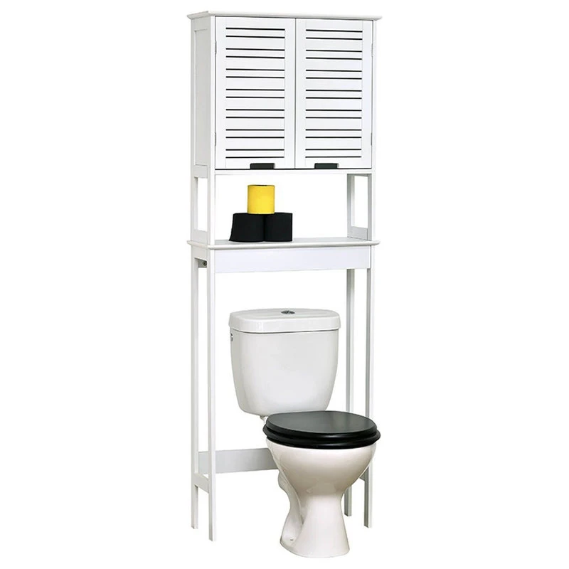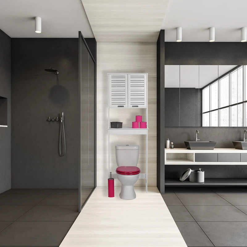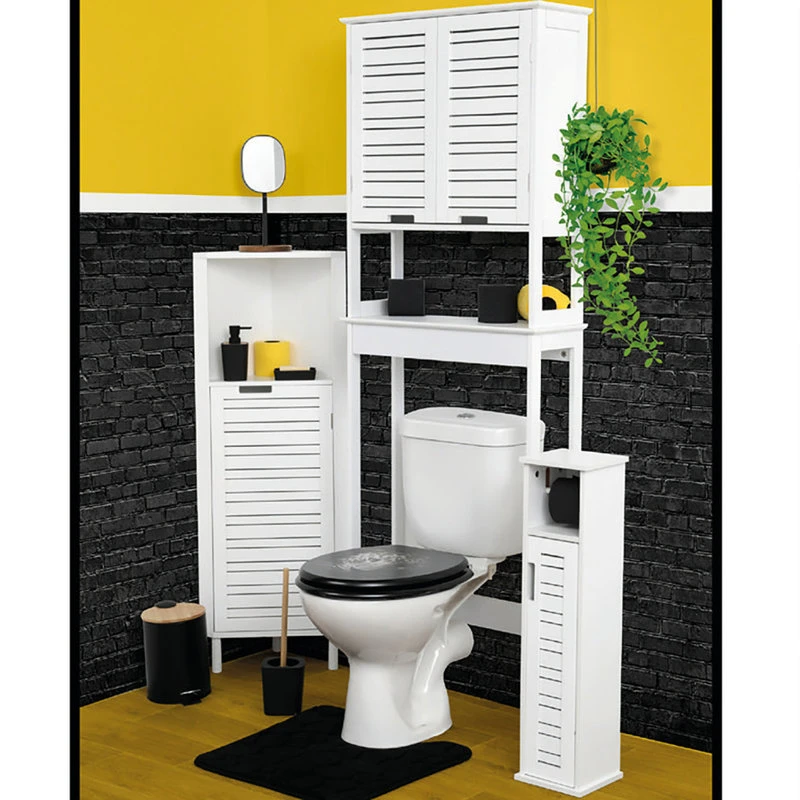 In small-size bathrooms or even in any bathroom, no space should go to waste. This Over The Toilet Storage Cabinet Bathroom Miami White Wood is the perfect storage solution. Keep a perfectly organized bathroom and make the best use of limited space with this attractive bathroom furniture. This above toilet linen cabinet features one open shelf and a closed cabinet, with 1 inside shelf (non adjustable). Thus, it offers plenty of space for all your bathroom accessories. The 2 white louvered doors ensure a good air flow and are magnetized to stay securely closed. Moreover, this freestanding wall cabinet is ideal for keeping your bathroom essentials right at your fingerprints without sacrificing valuable floor space. Not only perfect to display decorative items or to store toilet paper rolls, towels and Knick knacks. But also ideal for banishing clutter from your bathroom and for keeping items off the floor and at eye level. To sum up, this over the toilet shelf cabinet Miami provides an elegant and modern look to any bathroom. Finally, complete your decoration with other products of the same collection Miami. In addition to your cabinet, you can add under sink, floor or over-the-toilet cabinets, toilet paper reserve or tower unit.