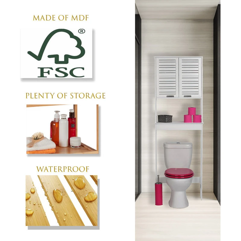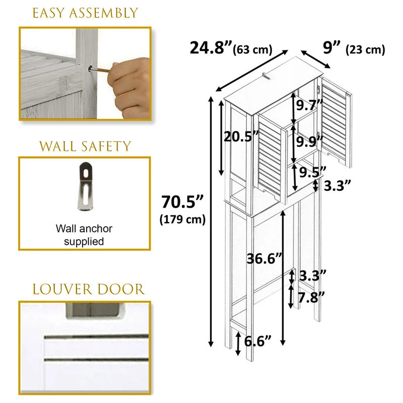 - MADE OF WOOD/MDF: This above the toilet cabinet is made of white painted sturdy wood (MDF). The 2 doors have an easy opening with U-shape cutout handles. Also, the louvered doors ensure a good air flow and are magnetized to stay securely closed
