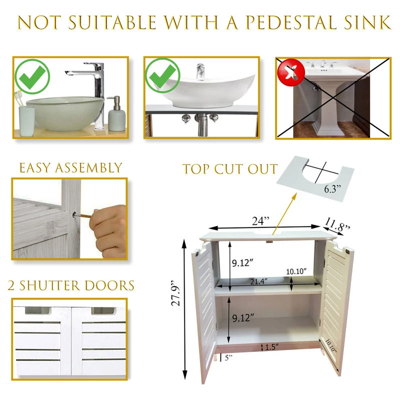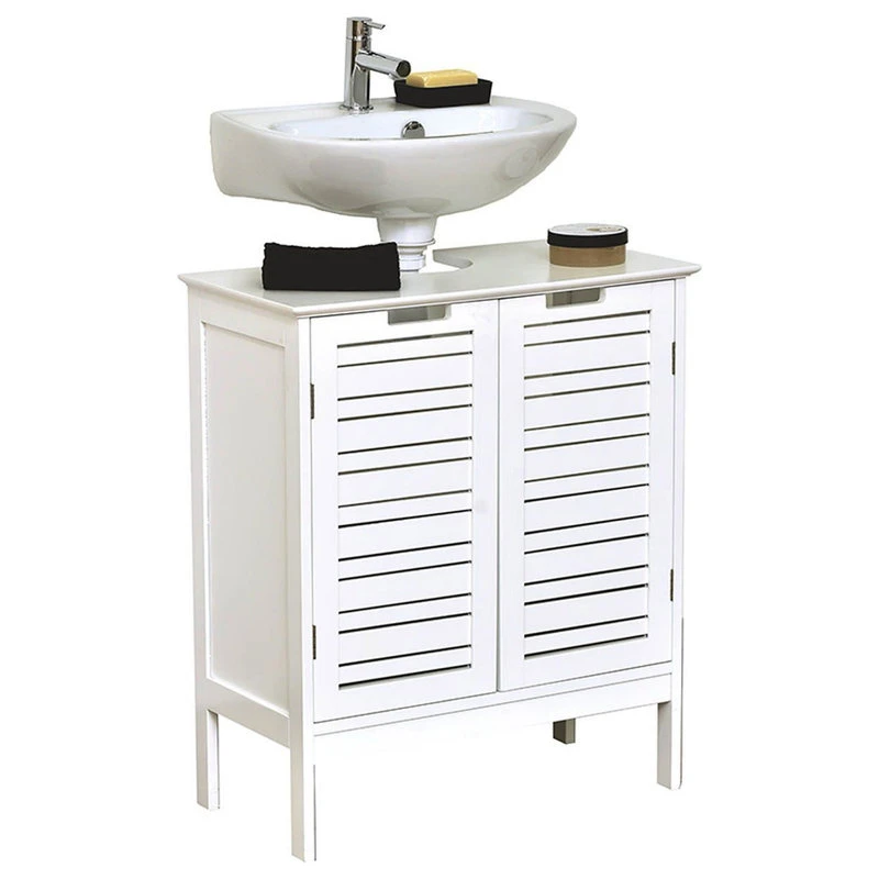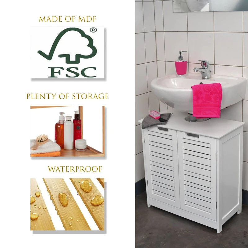 - MADE OF WOOD/MDF: This under sink cabinet is made of white painted sturdy wood (MDF). The 2 doors have an easy opening with U-shape cutout handles. Also, the louvered doors ensure a good air flow and are magnetized to stay securely closed