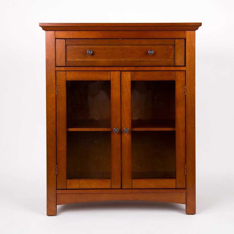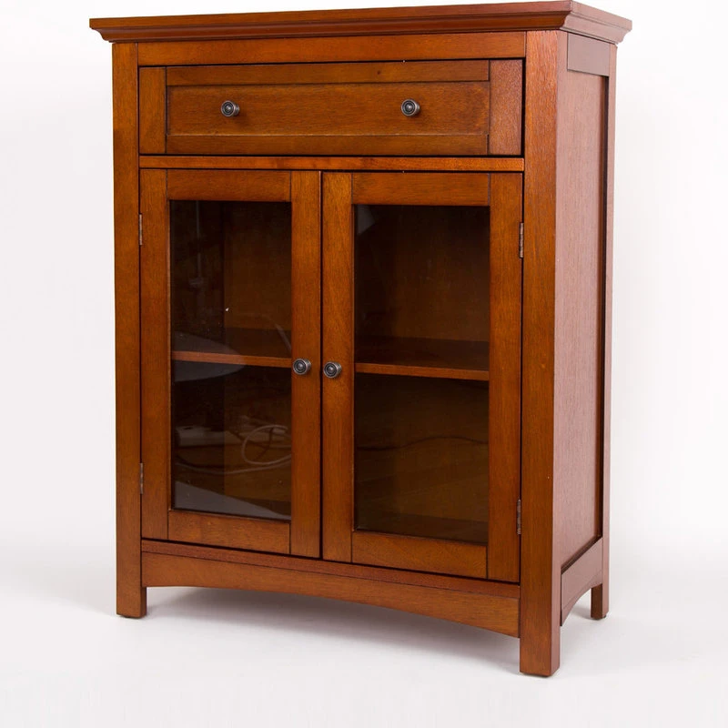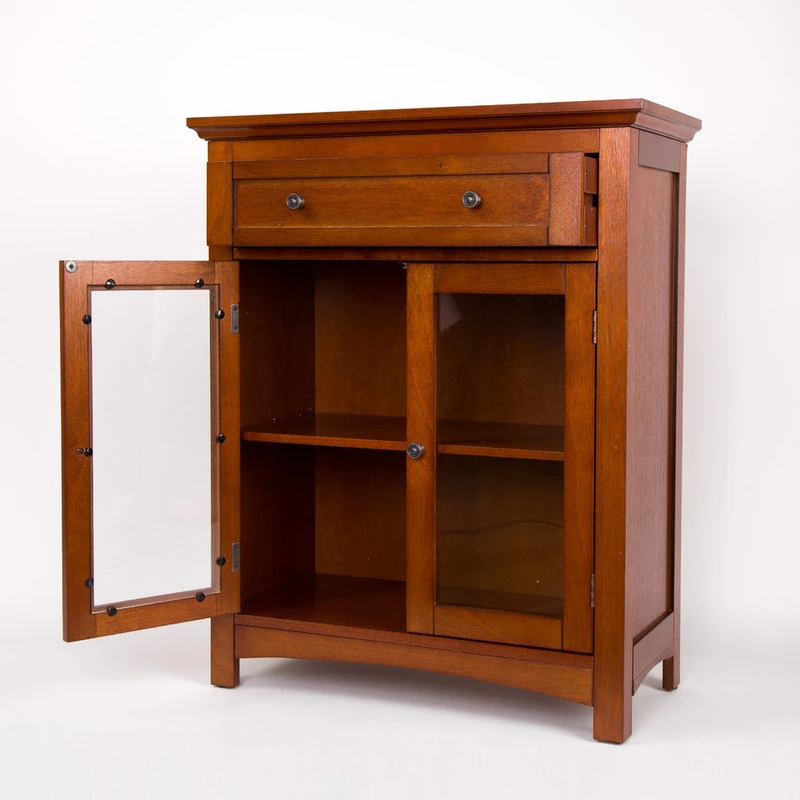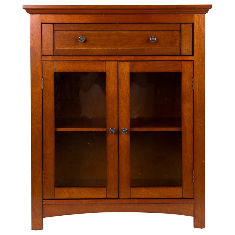 The wooden floor storage cabinet features a glass door and a drawer in a brown finish.The cabinet’s classic design offers ample storage, wooden glider drawer allows for easy open and close. Made of sturdy MDF wood and handcrafted with care. It measures 25.6″L*12.6″W*32″H. Perfect for TVs steroes, lamps and other items to show off or store your china and cutlery for the dining room.