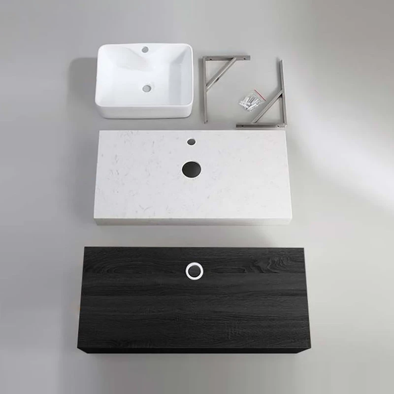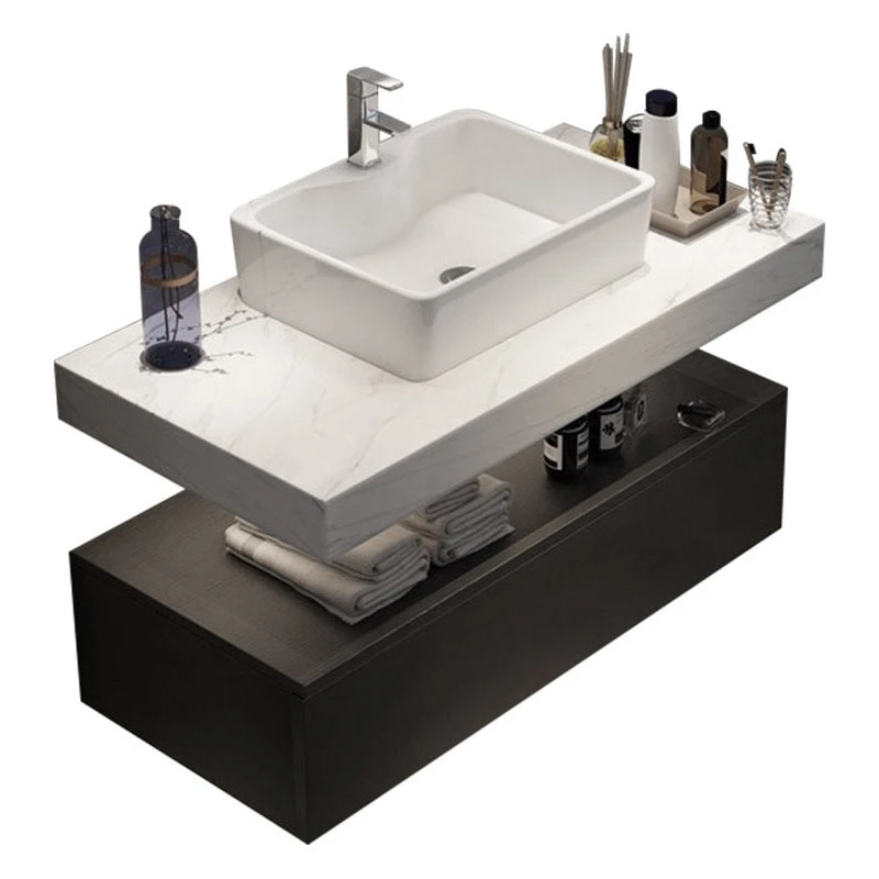 - Includes a ceramic vessel sink, a faux marble top and a wooden drawer.