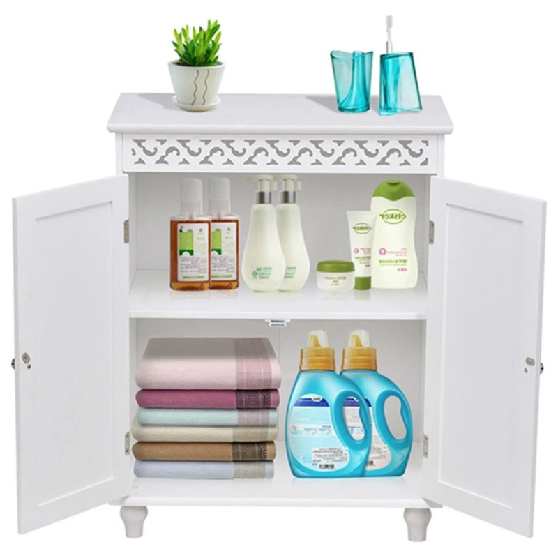 Create a cleaner, tidier and more attractive bathroom space with this White Modern 2-Door Bathroom Storage Floor Cabinet. Perfect for keeping your bathroom clutter free, it features 2 shelves to conceal towels, toiletries and other essentials. The cabinet is made from hardwearing MDF with a clean white finish to complement classic and modern interiors. Finished with a contemporary silver-colored handle, the cabinet door houses an adjustable shelf to customize your storage space. You can also decorate the top of the unit with candles and other objects to add color and character to your bathroom.