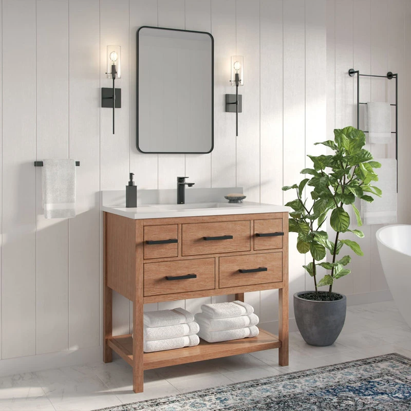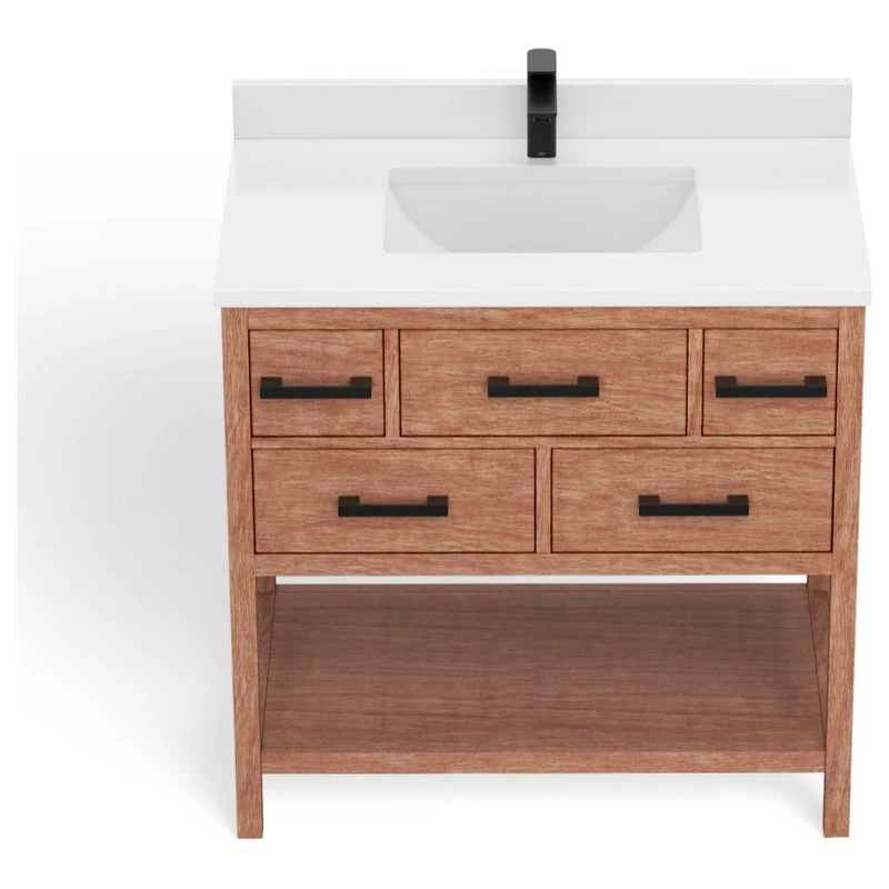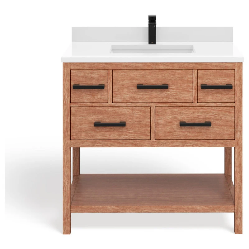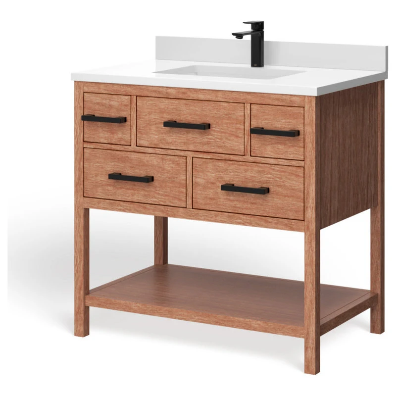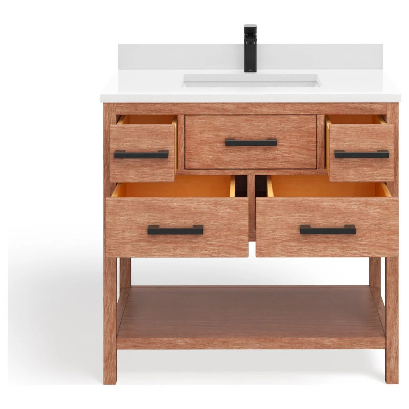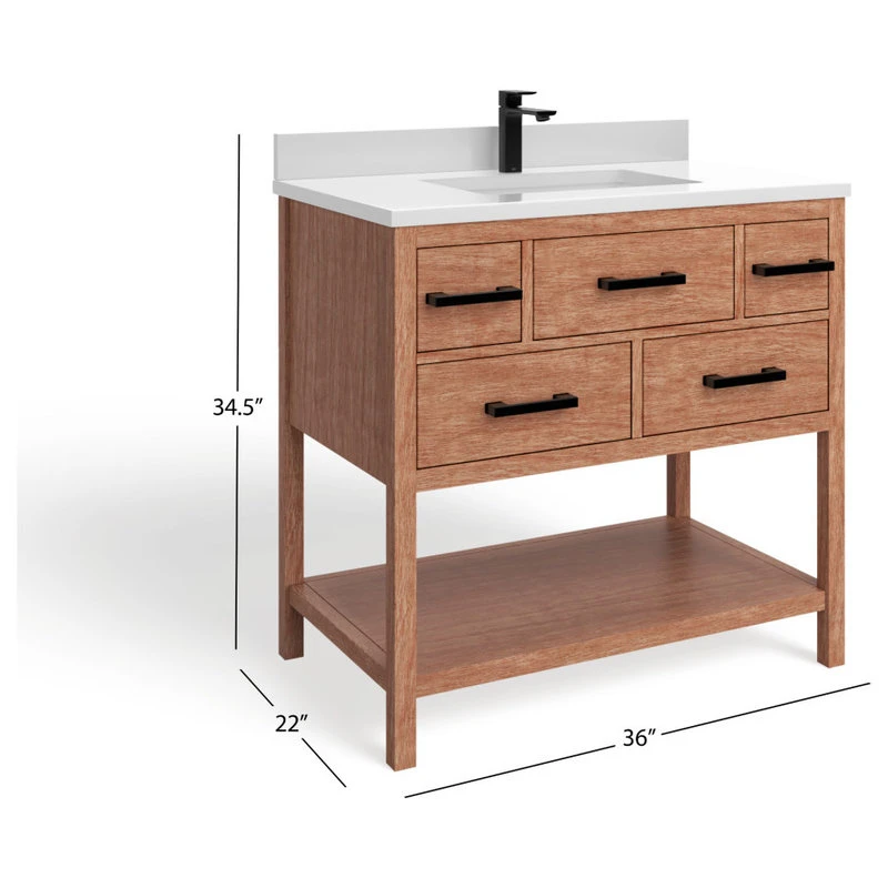 Whether your bathroom aligns with a modern minimalist aesthetic or a cozy traditional touch, the Adal single sink vanity is the perfect decorative chameleon. With a raised grain finish and a glossy quartz countertop, this expertly crafted vanity holds its own in any style setting. Storage space is nothing to be desired when you have plenty of soft-closing dovetailed drawers and a full lower realm of open shelving. Functional and gorgeous, the best of both worlds.