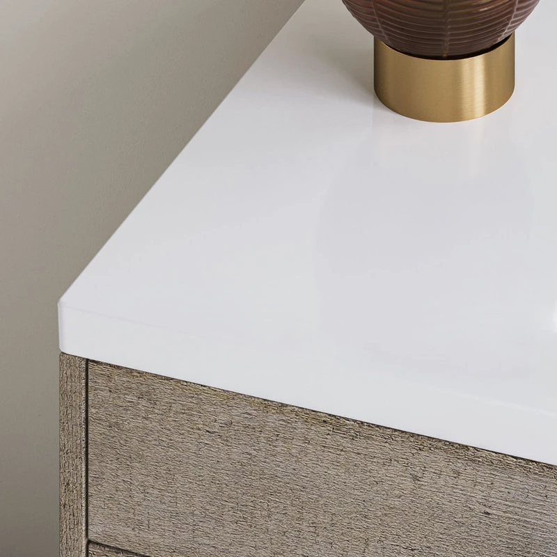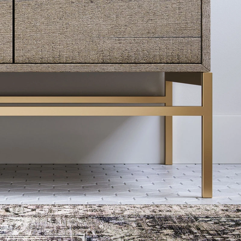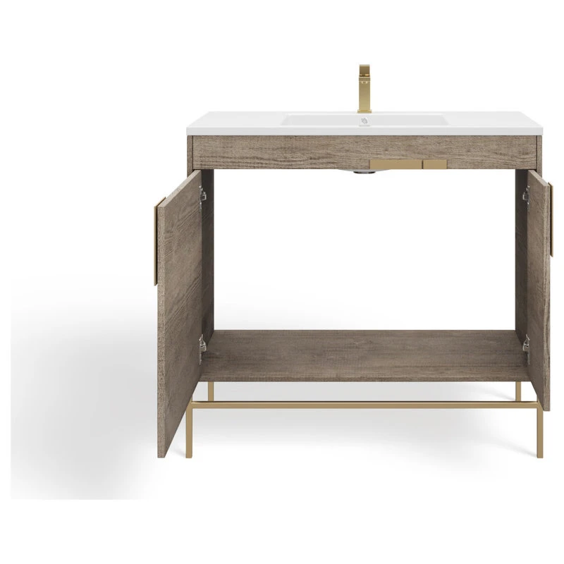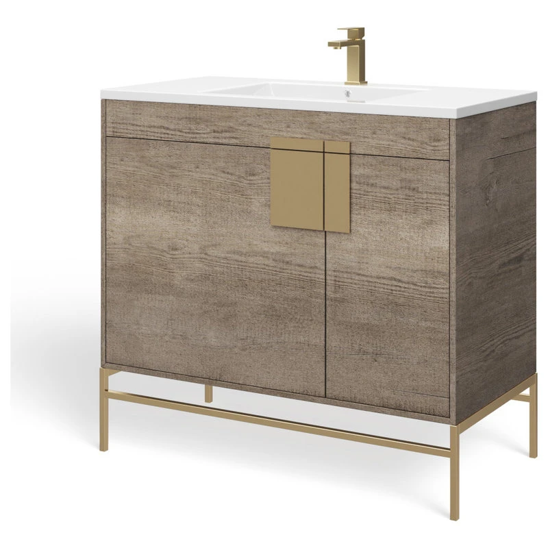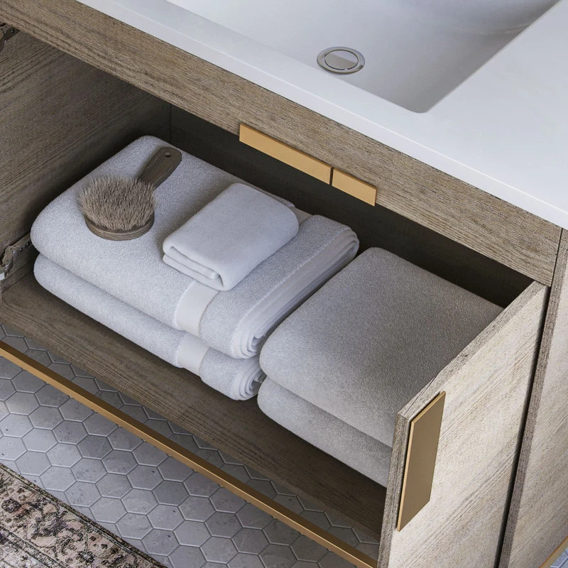 This striking, freestanding vanity with modern finishes will turn any bathroom into a showstopper. Its sturdy wood base with satin brass hardware commands the spotlight while the white vitreous china sink plays an impressive supporting role. The roomy cabinets with soft-closing doors and hidden hinges can accommodate all your bathroom essentials, and smooth surfaces from top to bottom make clean-up a cinch. Add your own mirror and faucet to amp up the glam or mellow the tone – the choice is yours.