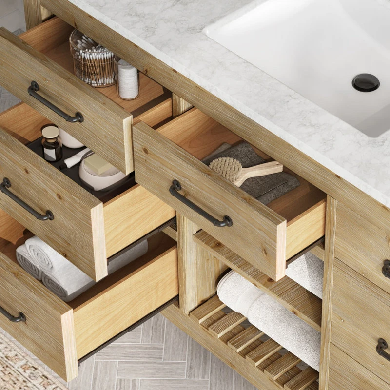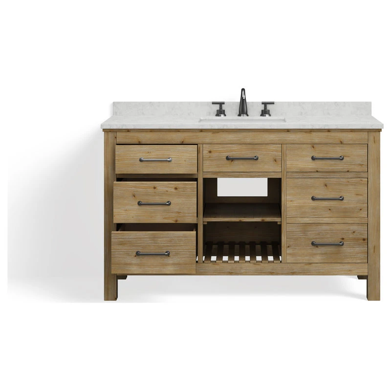 Revitalize your bathroom with the Rawley 55″ single sink vanity. This hand-crafted, eye-catching centerpiece is built to last a lifetime, with its authentic Italian Carrara marble countertop effortlessly supported by a sturdy and warm solid fir wood base. Each drawer is ready to house any bathroom essentials that need a home thanks to its expertly crafted,long lasting dovetail joints. There’s no denying that this rustic, freestanding vanity is built to be the star of any farmhouse remodel.