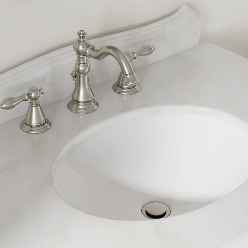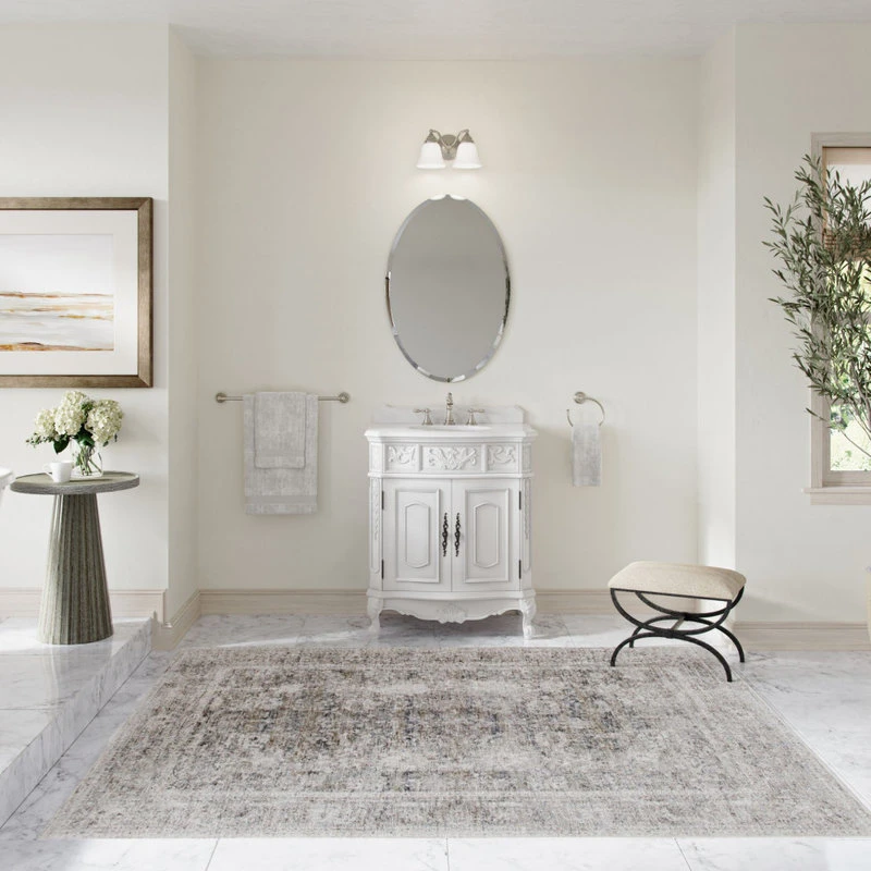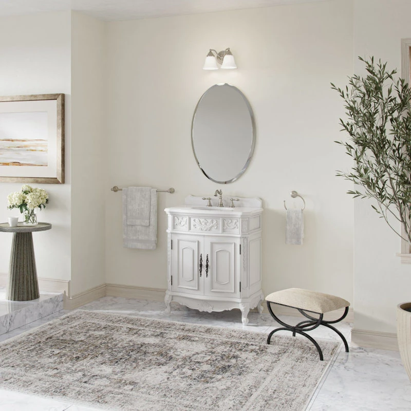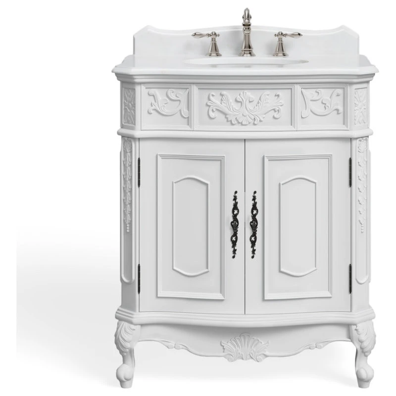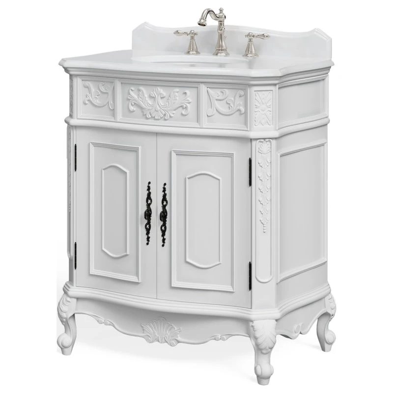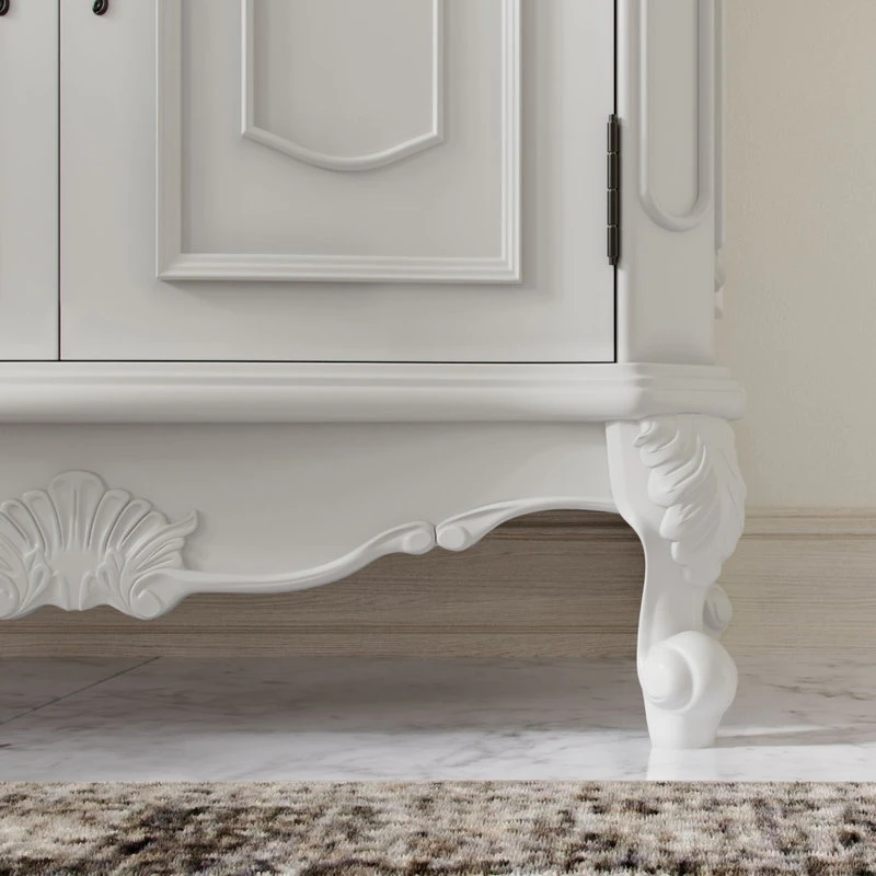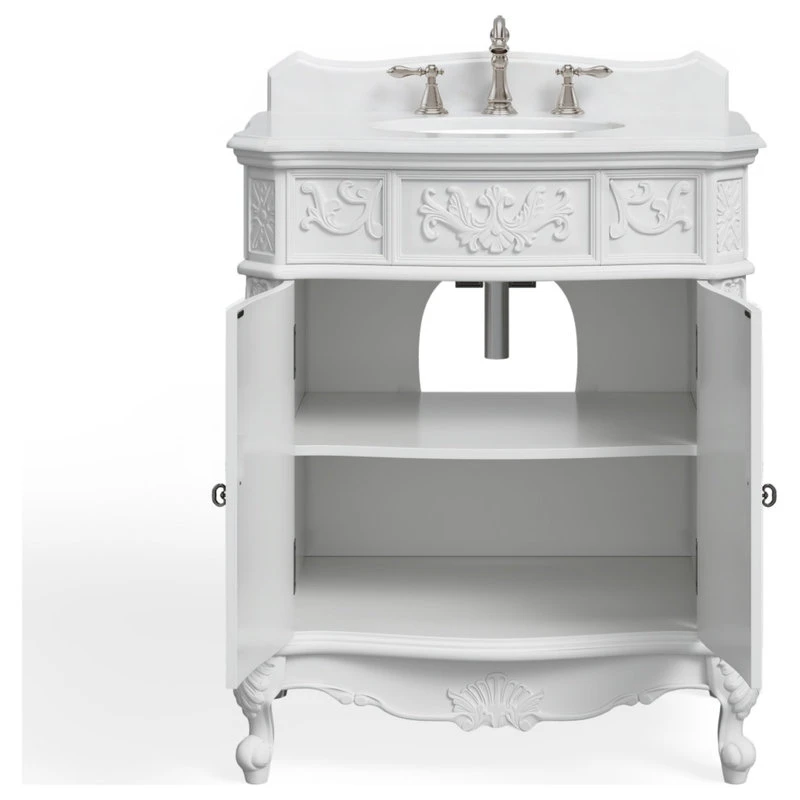 Open the door to days long gone with the Bloomdale—a Victorian-style bathroom vanity with all the vintage charm of a true antique. Its hand-polished marble countertop is cut to the curves of its whitewashed wood cabinetry below. You’ll love its porcelain sink and the fact that it all comes pre-assembled, too. With handcrafted carvings that elegantly weave from feet to doors and beyond, the Bloomdale is a remarkably refined piece with a dedication to detail that speaks for itself.