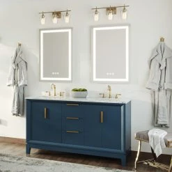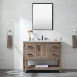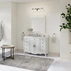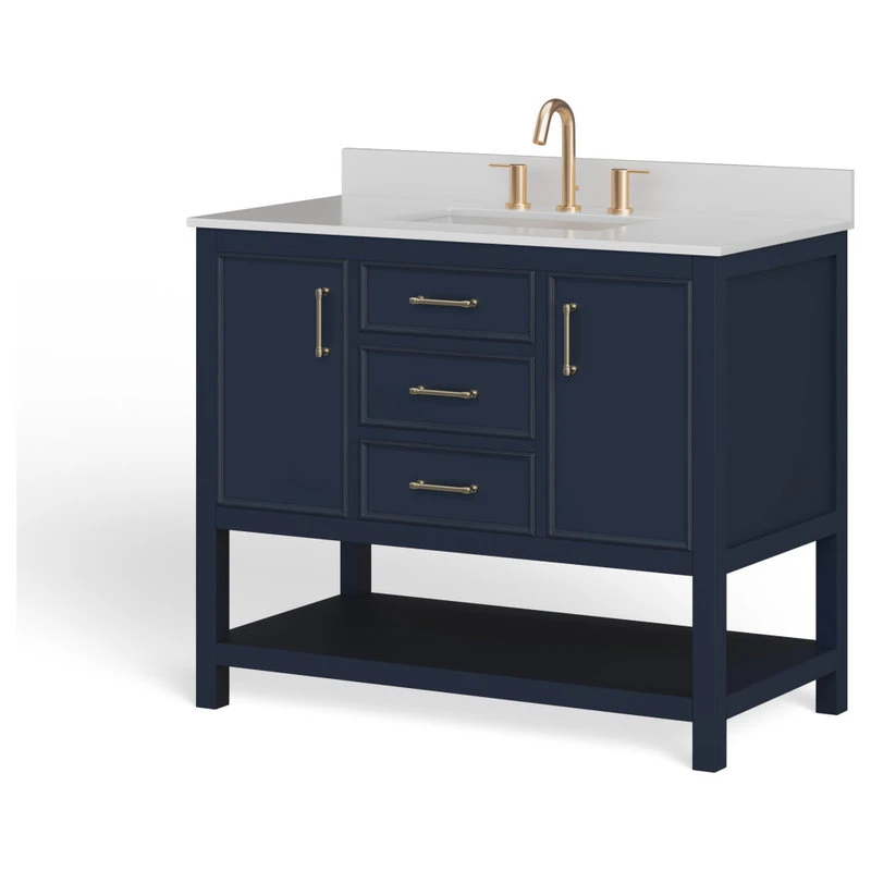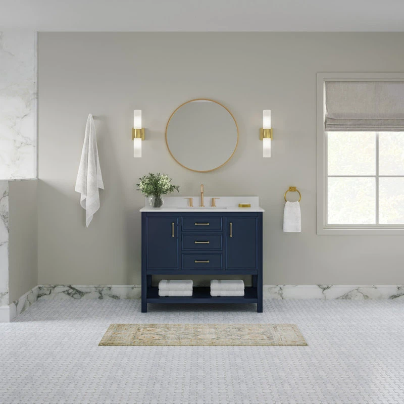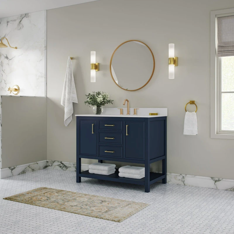 First impressions are everything, so choosing the right style for the biggest piece in the bathroom is key. Eco-conscious, style savvy, and truly unforgettable, this transitional vanity, crafted with solid wood and plywood, belongs at the top of any remodel wishlist. Modern contemporary cabinets lathered in lead-free, water-based paint and topped with a quartz countertop greet you as you enter the space. Gold brushed nickel handles add luxurious contrast—just give them a pull and experience full-extension metal sliders that enable easy access to your toiletries.