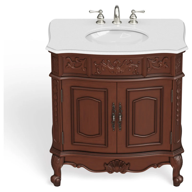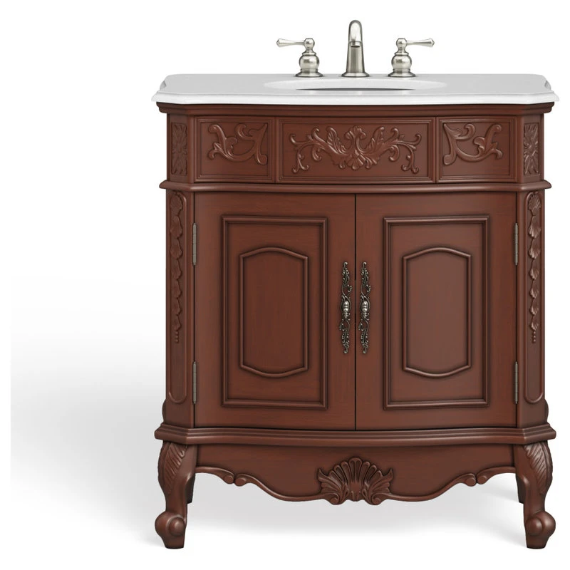 Gloriously detailed, this traditional vanity starts with a solid wood base for the intricate carvings, and ends with a lustrous cherry finish…but that’s not the whole story. With its hand-polished marble counter and porcelain sink, the Carlton’s primary job is to lavishly spoil all hand washers—from owners to guests—before bidding them adieu. And with plenty of cabinet space for luxurious soaps and fluffy towels, this beauty will be stocked with everything it needs to successfully complete its mission.