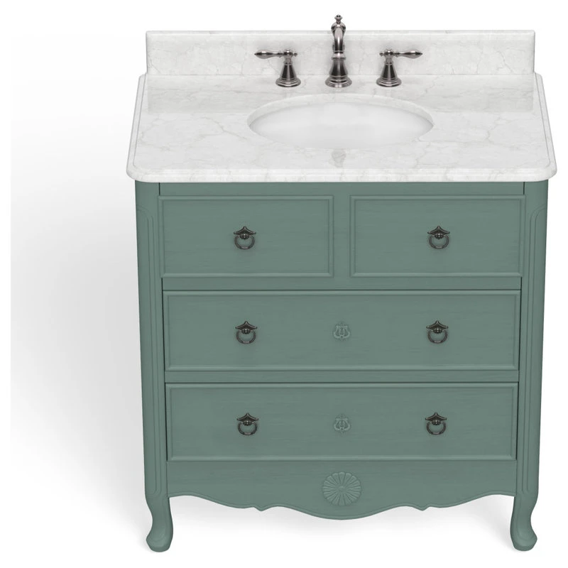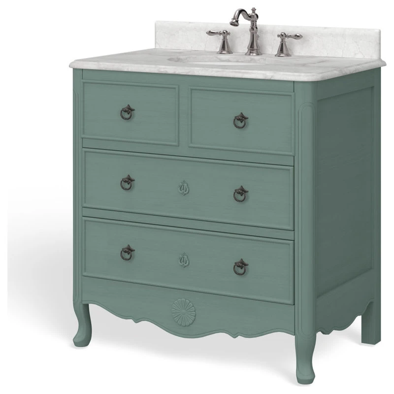 Can rustic and elegant coexist? The Clara is proof that it can. Charming from its ornate carvings to its metal drawer pulls, this traditional bathroom vanity has an antique ambiance few in its class can match. Its white marble countertop sets the stage for your daily routine while its tastefully distressed wood drawers leave no essential unstored. With an included backsplash and porcelain undermount sink, the Clara is where old-fashioned comforts meet modern-day quality.