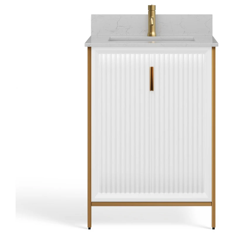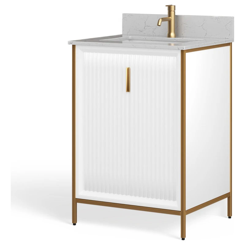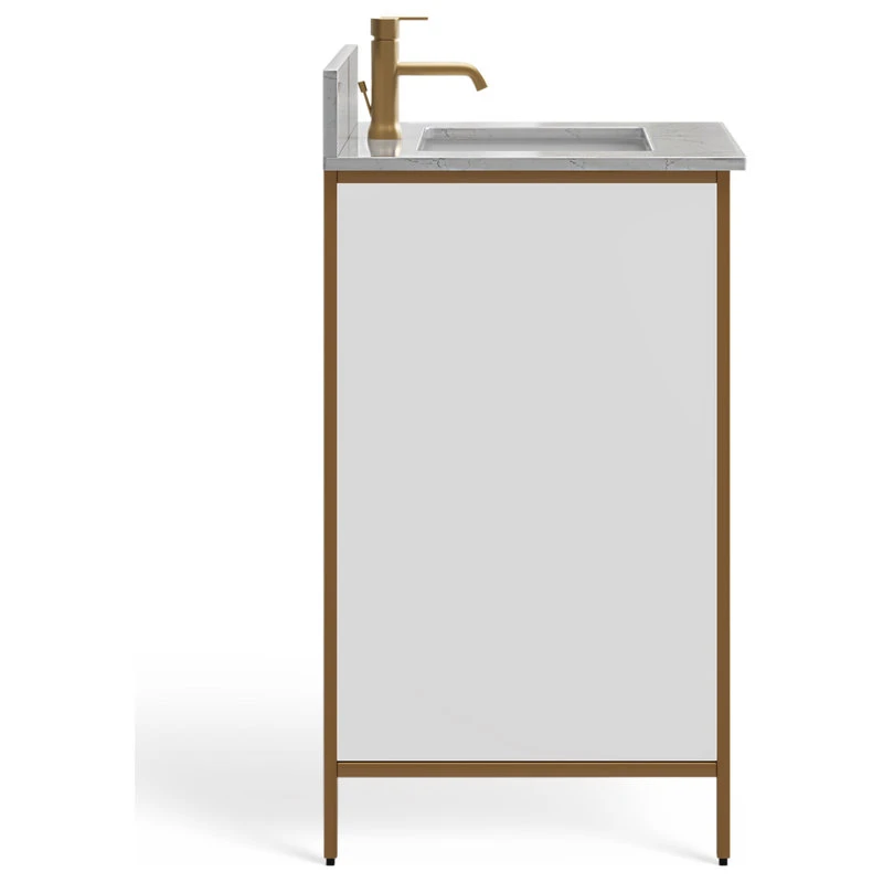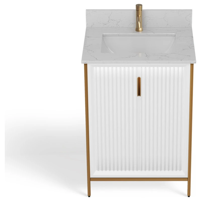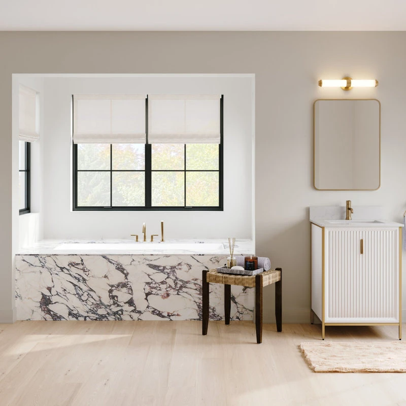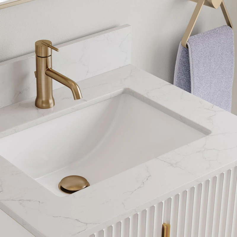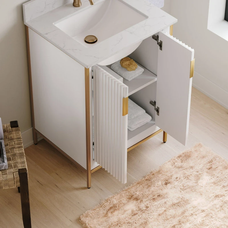 When the clock strikes “me time,” escape to the comforts of the Everleigh. This playfully sophisticated vanity combines contemporary style with golden pops of glamour for just the right amount of modern. Marbled composite stone with natural veining sits atop corrugated cabinet doors which offer up ample storage. You’ll love its soft-close hardware and rectangular undermount sink design almost as much as its gold-finished metal frame and handles. Whatever you’re freshening up for, the Everleigh has everything you need – plus bonus style points to boot.