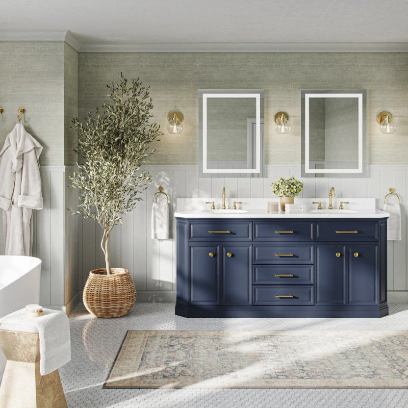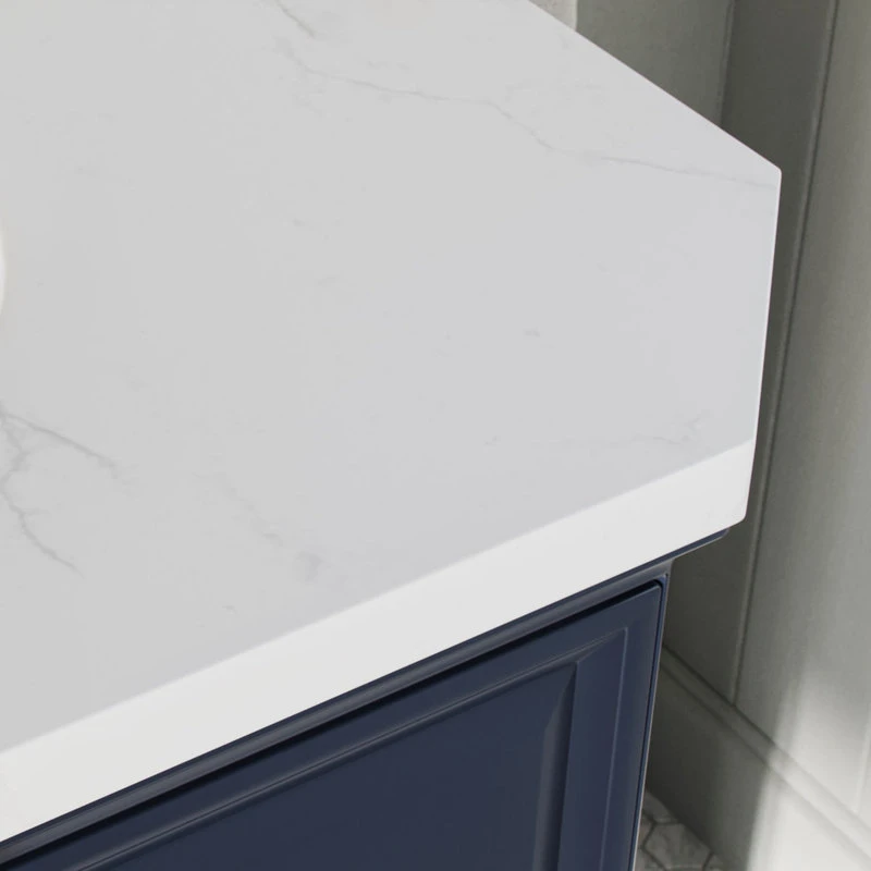 - Vanity top material: high-quality, polished 1.56″ thick white quartz countertop