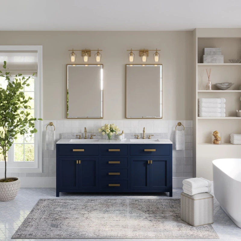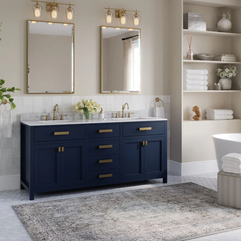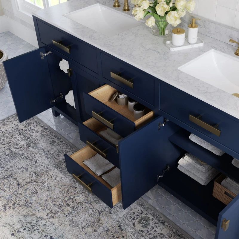 With rich contrasting colors and premier construction, the contemporary Savoy takes elegant craftsmanship to a whole new level. The solid wood base is kiln dried to avoid expansion, contraction, and warping, while the multi-step finish (in a gorgeous shade of blue) acts as a protective outer shell. And did we mention the sealed marble counter resists stains and watermarks? That�s right, go ahead and use this stunner day and night without a worry in the world.