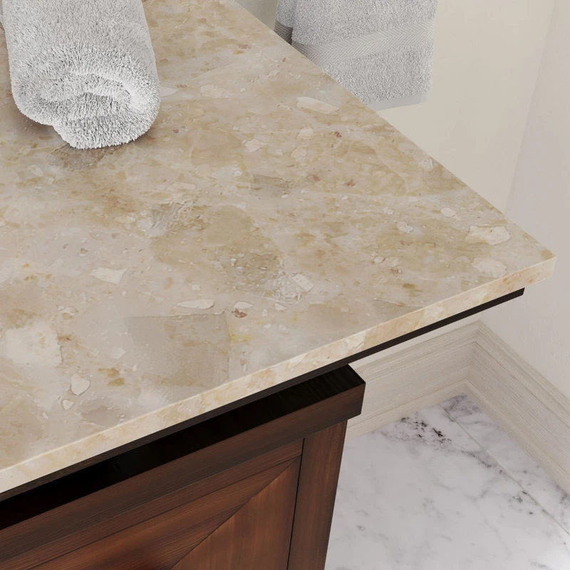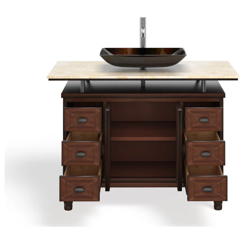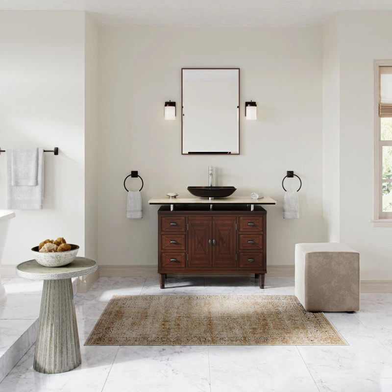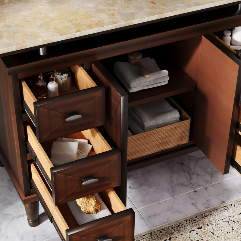 A twist on traditional bathroom vanities, the Woodard is for those living on the line between classic and contemporary. Its yellow cultured marble counter hovers inches above its wood cabinetry while its contrasting vessel sink offers a splash of elevated elegance. Do you prioritize storage? So does the Woodard with its spacious six-drawer-and-double-door cabinet design. Constructed of durable, dark brown-finished solid wood, it’s as sturdy as it is striking—the ideal addition to almost any bathroom.
