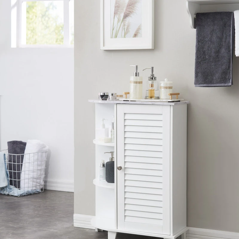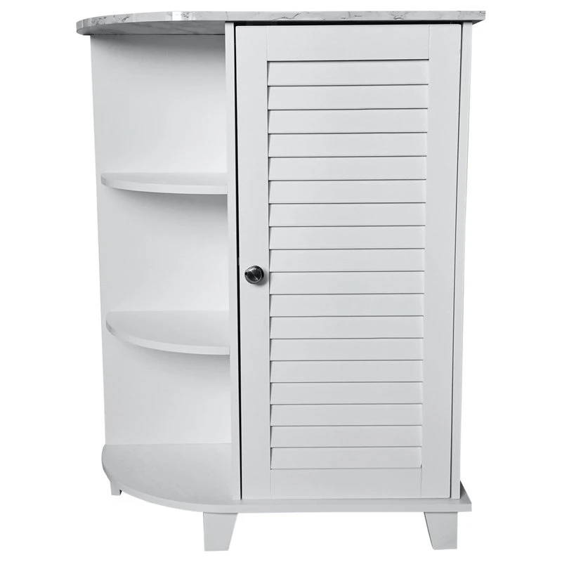 Corolla Bathroom Storage Floor Cabinet Organizer With Adjustable Shelf & 3 Open Shelves, White & Marble Wood, Contemporary. Between lotions and soaps, shaving creams and cotton swabs, we could all use a little extra storage space in the bathroom. With this Corolla Bathroom Cabinet, you can instantly expand your storage and the charming design strikes a rectangular silhouette and gleaming nickel hardware. The three open cubby shelves are great for storing candles or rolled-up face cloths, while an adjustable shelf behind the hinged door offers out-of-sight storage for toiletries and bathroom supplies.