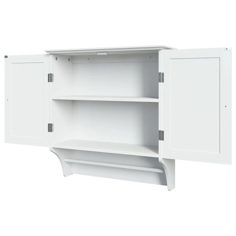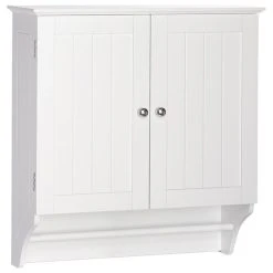 Hide toiletries and other bathroom items behind cabinet doors for a clean presentation with the RiverRidge Home Ashland Collection Two-Door Wall Cabinet. Additional dimensions: interior fixed shelves: 21.75-in. W x 7.5-in. D, and space between interior shelves: bottom – 8.75-in. H and Top – 8.94-in. H.