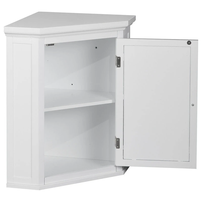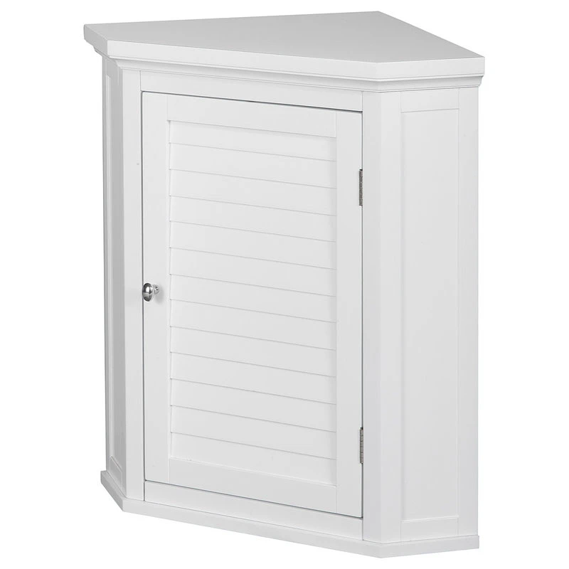 Upgrade your home storage while adding classic style with the Teamson Home Glancy Wooden Corner Wall Cabinet with Shutter Door. This decorative cabinet features a timeless white finish with a crown molded top and skirting, a chrome-finished knob, a louvered door, and shaker-style legs for a beautiful addition to your space. The included interior shelf makes this cabinet perfect for your daily storage needs. Constructed from durable engineered wood, this storage unit is built to provide you with long-lasting organization. Easy, step-by-step instructions and all of the hardware needed for installation are included for quick assembly. Purchase this stylish corner cabinet alone or with other items from the Glancy collection for a cohesive, updated look.