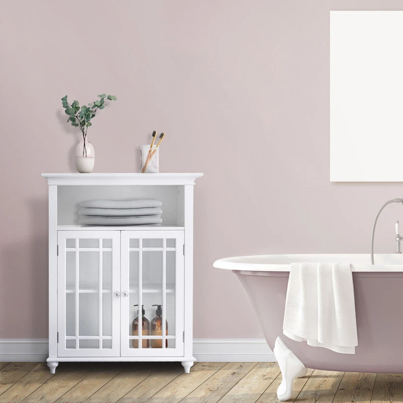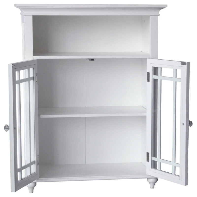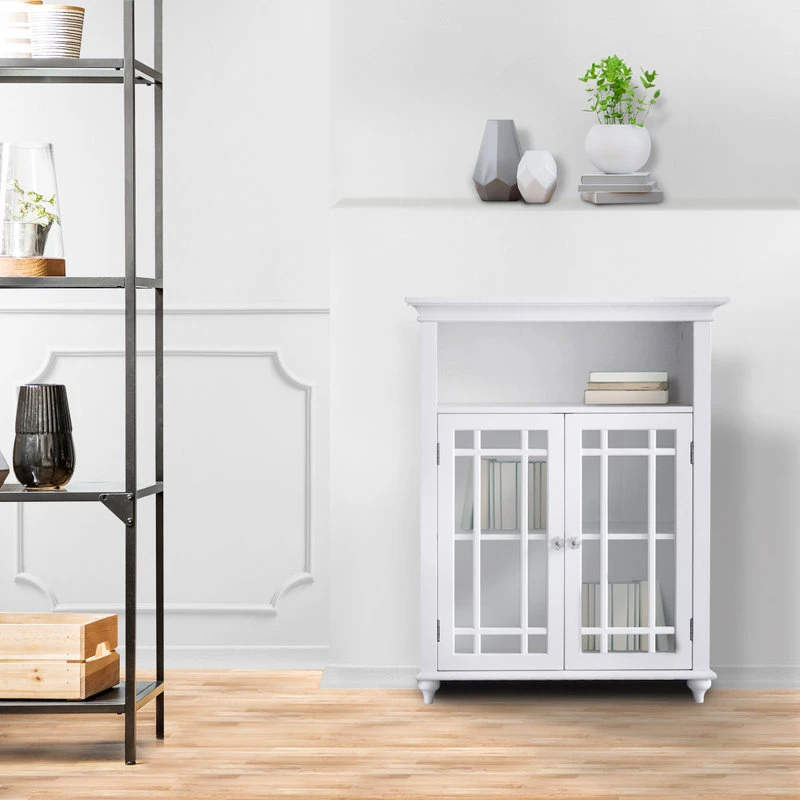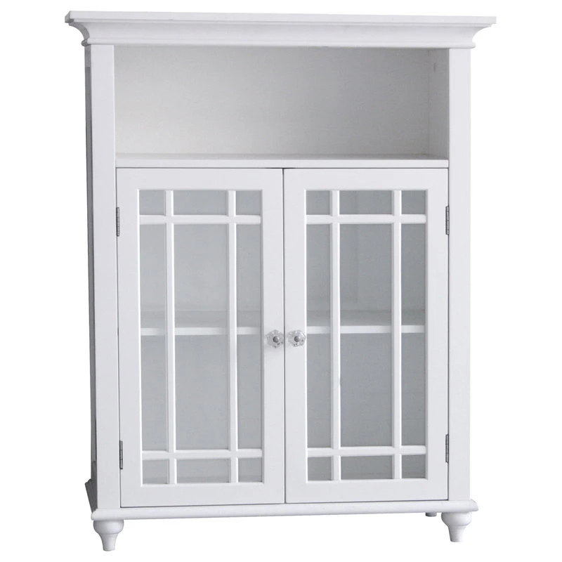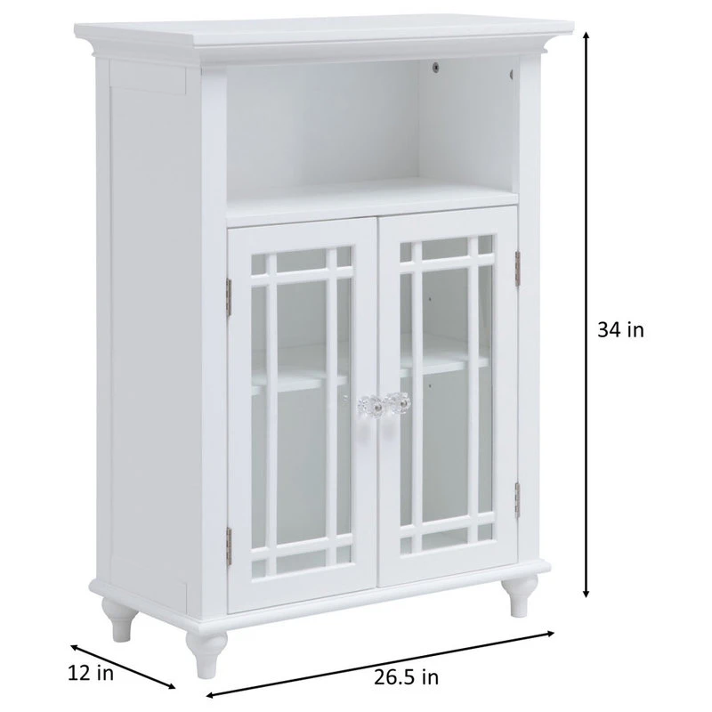 Upgrade your home storage while adding classic decor with the Elegant Home Fashions Neal Wooden Floor Cabinet with 2 Glass Doors. This decorative cabinet features a white finish with 2 glass doors decorated with grid molding and clear knobs for a beautiful addition to your space. The included adjustable interior shelf helps to reduce clutter and keep your home tidy. Constructed from durable engineered wood and tempered glass, this floor cabinet is built to provide you with long-lasting organization. Easy, step-by-step instructions and all of the hardware needed for installation are included for quick assembly. Purchase this stylish cabinet alone or with other items from the Neal collection for a cohesive, updated look. The Elegant Home Fashions Neal Wooden Floor Cabinet with 2 Glass Doors measures 12″ x 26.5″ x 34″ to provide accessible storage without taking up too much space in your living area or bathroom.