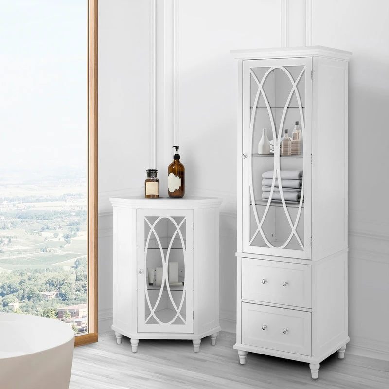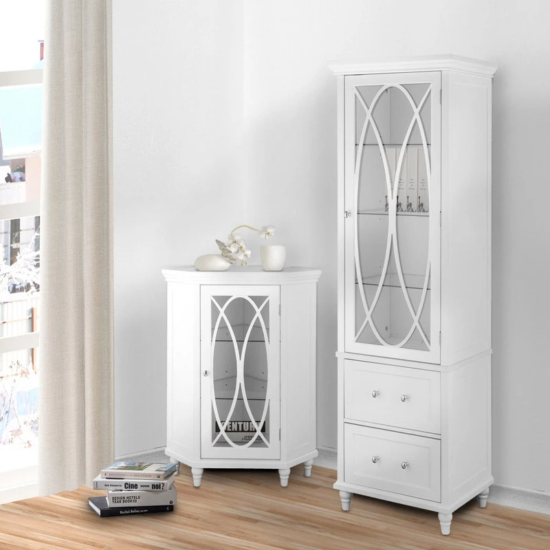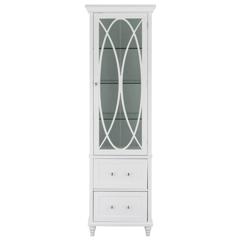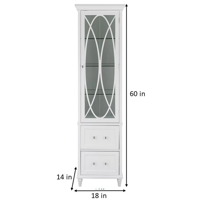 Upgrade your home storage while adding classic style with the Elegant Home Fashions Florence Wooden Linen Tower Cabinet with Storage. This stylish storage solution features a white finish with satin nickel-finished hardware for a timeless addition to your space. The 3 included adjustable glass shelves and 2 storage drawers provide ample storage to reduce clutter and keep your home tidy. Constructed from durable engineered wood and tempered glass, this linen tower is built to provide you with long-lasting organization. Easy, step-by-step instructions and all of the hardware needed for installation are included for quick assembly. Purchase this stylish linen cabinet alone or with other items from the Florence collection for a cohesive, updated look. The Elegant Home Fashions Florence Wooden Linen Tower Cabinet with Storage measures 18″ x 14″ x 60″ to provide accessible storage without taking up too much space in your living area or bathroom.