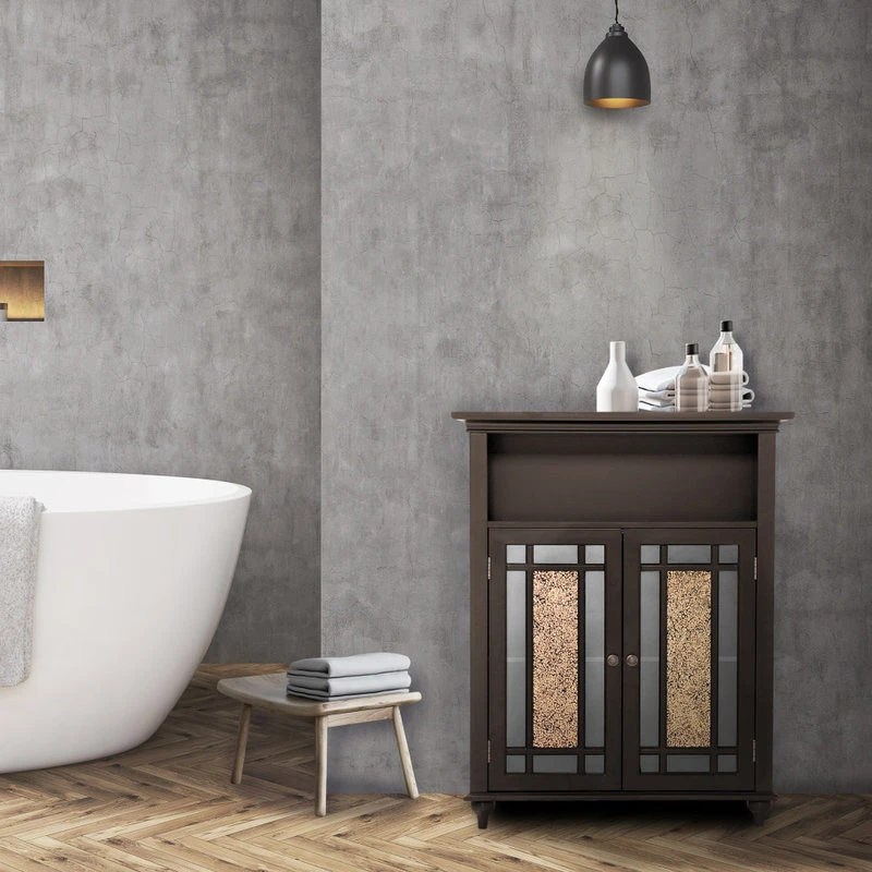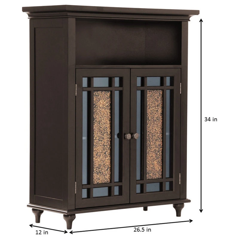 - STYLISH FLOOR CABINET: Features a timeless dark espresso finish with amber glass mosaic doors, beveled trim, and rubbed bronze-finished knobs for a beautiful addition to your space