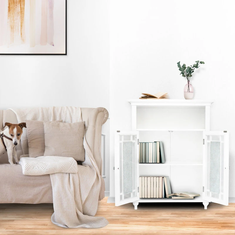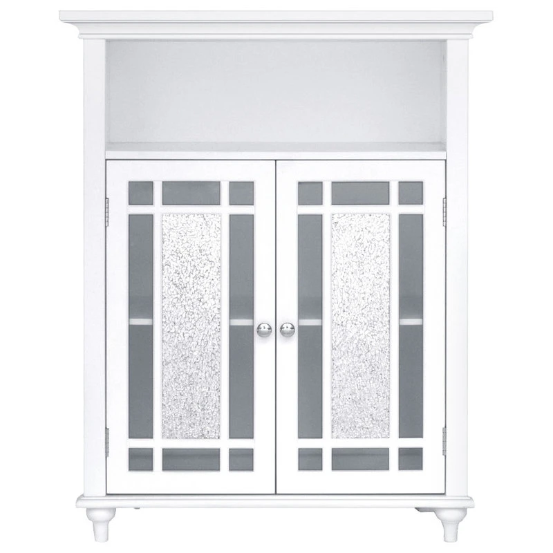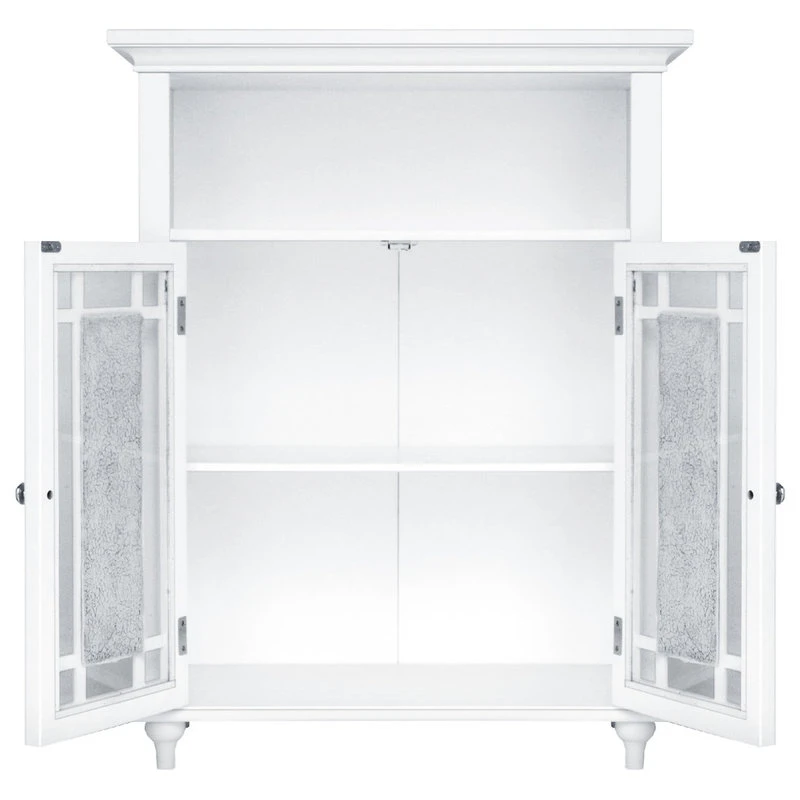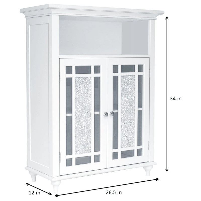 Upgrade your home storage while adding classic decor with the Elegant Home Fashions Windsor Wooden Floor Cabinet with Glass Mosaic Doors. This decorative cabinet features a timeless white finish with silver glass mosaic doors, beveled trim, and chrome-finished knobs for a beautiful addition to your space. The included adjustable shelf makes this cabinet functional and customizable to suit your storage needs. Constructed from durable engineered wood, this storage unit is built to provide you with long-lasting organization. Easy, step-by-step instructions and all of the hardware needed for installation are included for quick assembly. Purchase this stylish floor cabinet alone or with other items from the Windsor collection for a cohesive, updated look. The Elegant Home Fashions Windsor Wooden Floor Cabinet with Glass Mosaic Doors measures 12″ x 26.5″ x 34″ to provide accessible storage without taking up too much space in your living area or bathroom.
