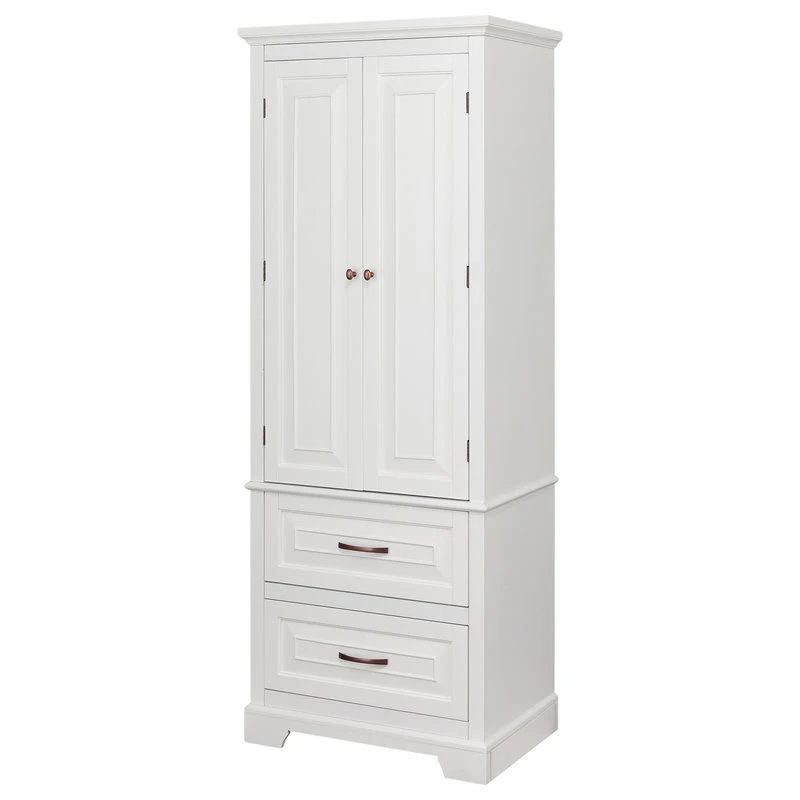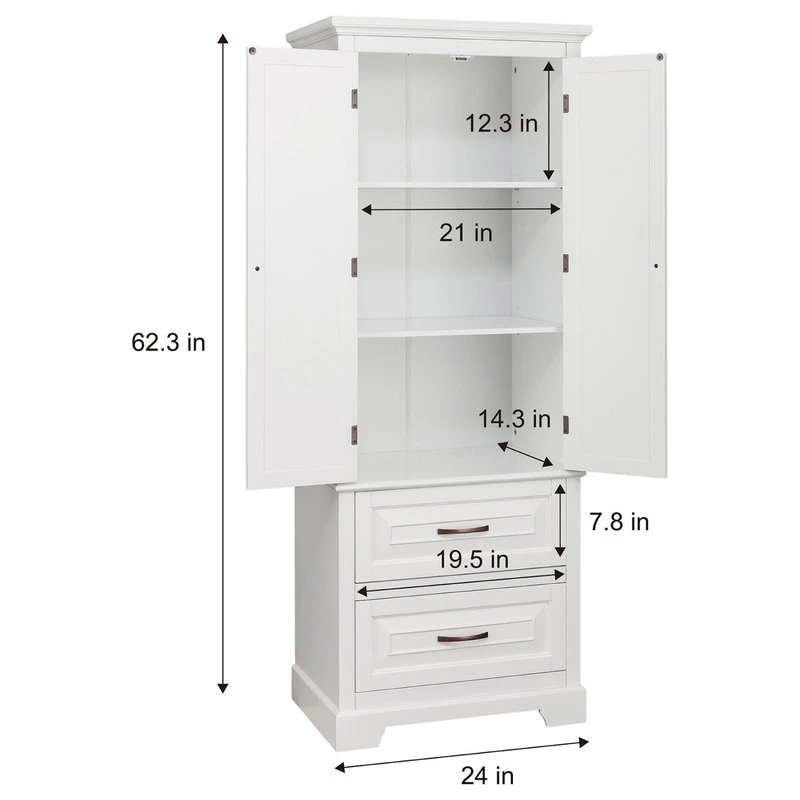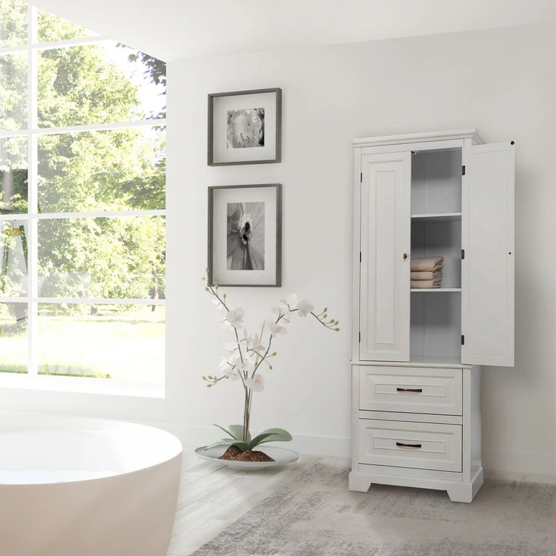- FUNCTIONAL: This tall linen cabinet has double doors with three interior shelves, and two drawers in the bottom. Allowing a lot of extra storage room for soaps, shampoos, towels, toiletries, and more but taking up little to no bathroom space.