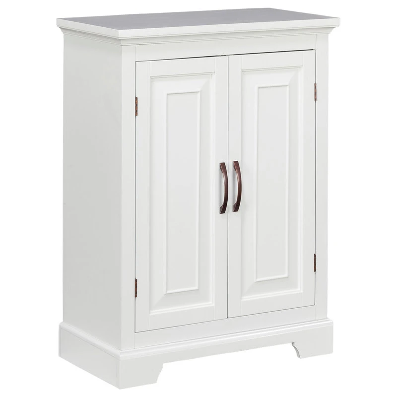 - Spotless white finish combined with clean lines and rubbed bronze finish door pulls , making this bathroom cabinet storage simple and classy.. Easy to understand assembly instructions offered in three languages: English, Spanish & French with a clear diagram style
