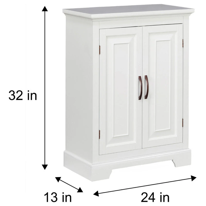 Upgrade your home storage while adding modern style with the Elegant Home Fashions St. James Wooden Floor Cabinet with 3 Shelves. This decorative cabinet features a sleek white finish with a crown molded top and a minimalist silhouette for a beautiful addition to your space. The 3 included interior shelves make this cabinet a functional solution to your storage needs. Constructed from durable engineered wood, this storage unit is built to provide you with long-lasting organization. Easy, step-by-step instructions and all of the hardware needed for installation are included for quick assembly. Purchase this stylish floor cabinet alone or with other items from the St. James collection for a cohesive, updated look. The Elegant Home Fashions St. James Wooden Floor Cabinet with 3 Shelves measures 24″ x 12.5″ x 32″ to provide accessible storage without taking up too much space in your living area or bathroom.