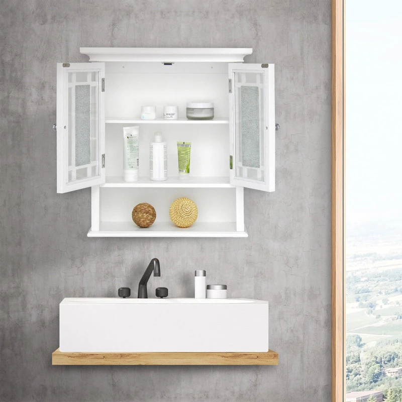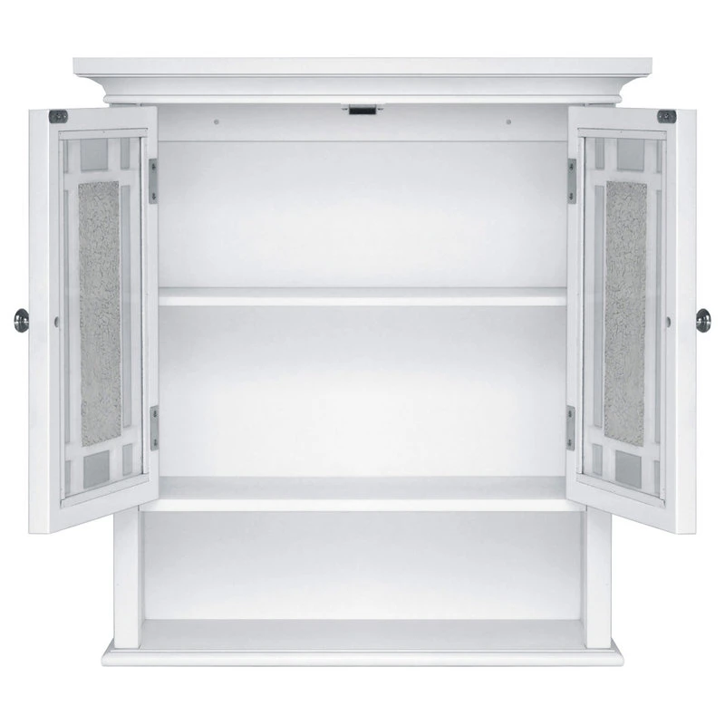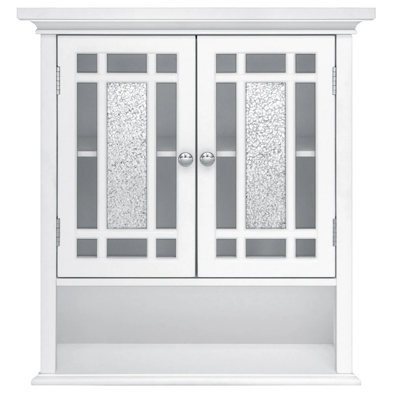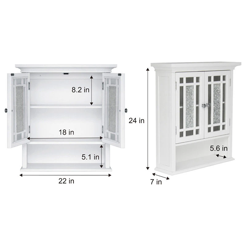 Upgrade your home storage while adding classic decor with the Elegant Home Fashions Windsor Wooden Removable Wall Cabinet with Glass Mosaic Doors. This decorative cabinet features a timeless white finish with silver glass mosaic doors, beveled trim, and chrome-finished knobs for a beautiful addition to your space. The included open shelf and adjustable shelf make this cabinet functional and customizable to suit your storage needs. Constructed from durable engineered wood, this storage unit is built to provide you with long-lasting organization. Easy, step-by-step instructions and all of the hardware needed are included for quick assembly. Purchase this stylish wall cabinet alone or with other items from the Windsor collection for a cohesive, updated look. The Elegant Home Fashions Windsor Wooden Removable Wall Cabinet with Glass Mosaic Doors measures 7″ x 22″ x 24″ to provide removable storage without taking up too much space in your living area.