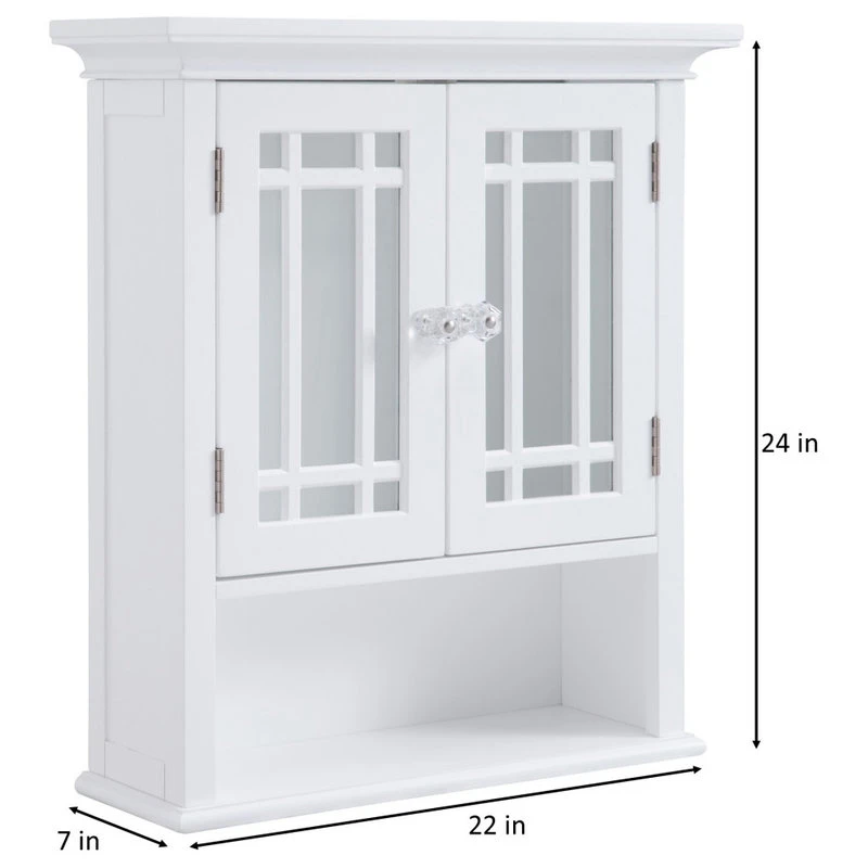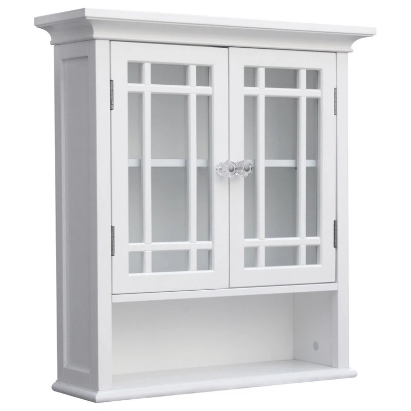 Upgrade your home storage while adding classic decor with the Elegant Home Fashions Neal Wooden Removable Wall Cabinet with 2 Glass Doors. This decorative cabinet features a white finish with 2 glass doors decorated with grid molding and clear knobs for a beautiful addition to your space. The included adjustable interior shelf helps to reduce clutter and keep your home tidy. Constructed from durable engineered wood and tempered glass, this wall cabinet is built to provide you with long-lasting organization. Easy, step-by-step instructions and all of the hardware needed are included for quick assembly. Purchase this stylish cabinet alone or with other items from the Neal collection for a cohesive, updated look. The Elegant Home Fashions Neal Wooden Removable Wall Cabinet with 2 Glass Doors measures 7″ x 22″ x 24″ to provide removable storage without taking up too much space in your living area.