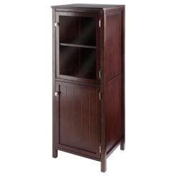 Brooke Jelly 2-Section Cupboard, Walnut Bring a French Country look and modern convenience to any storage needs with the Winsome Wood Brooke Jelly Cupboard. This 2-sectioned cupboard blends the warmth of Farmhouse styling with clean, simple lines to provide lovely and valuable storage. The wainscoting panels on the lower cabinet door and brushed silver cabinet pulls add an undeniable country charm that will change the look of the kitchen, dining area, or anywhere you need extra storage space. Use the upper cabinet with its tempered glass door to keep your favorite dishware or display collectibles. Both upper and lower cabinets have a removable shelf, and doors close with a soft, magnetic catch. Perfect in a country kitchen, dining room, or living room to create a variety of storage options. Constructed of solid and composite wood in a rich walnut finish. Combine this piece with other cupboards from the Winsome Brooke collection to create a modular set (each sold separately). Conveniently packed and shipped in 1 box, that includes the hardware necessary for assembling. Replacement part request can be submitted directly to the manufacturer within 60 days from date of purchase.Overall dimensions: 17.3W x 15.7D x 47.4HInside dimensions of each cabinet: 14.9W x 14D Height of each cabinet (with shelves in place): Upper section: 10″H Lower Section: 10.1″HCabinet shelves are removable but not adjustableStatic weight limit: Top: 25 lbs. Each shelf: 25 lbs.Assembly requiredShips in 1 box