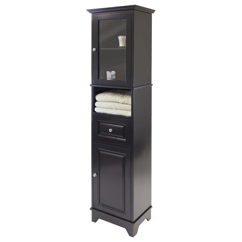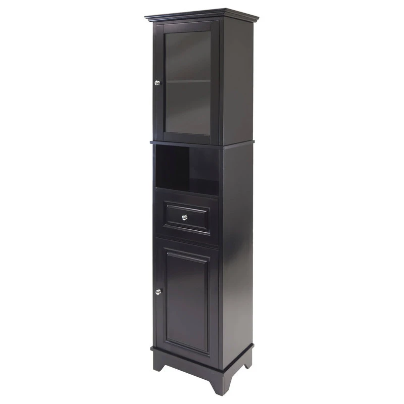 Alps Cabinet is a perfect addition to your kitchen, dining room, or even bathroom. Plenty of storage space with top section featuring a glass door that opens to one adjustable shelf to show your valuables or essentials. Cabinet storage size 14W x 11D x 22.4H. An open cubed space below the cabinet is 14W x 11.6D x 8.5H. One drawer with inside dimensions 13W x 9D x 6.3H. The enclosed bottom cabinet with an adjustable shelf, 14W x 11D x 22.4H. Combination of solid and composite wood in black finish. Assembly required.