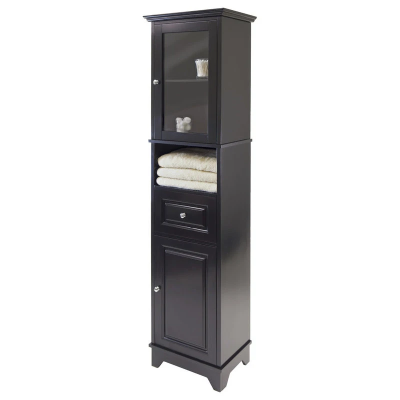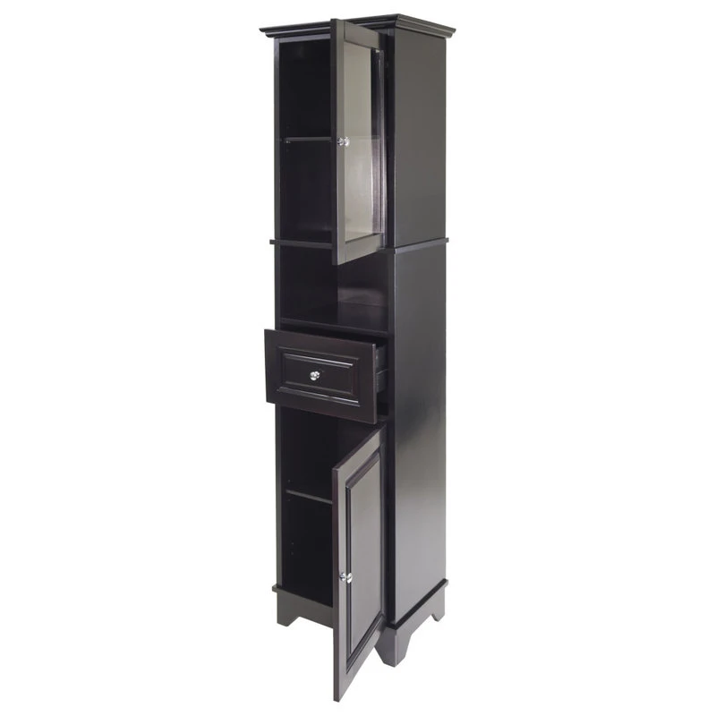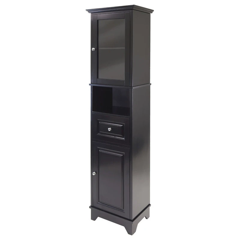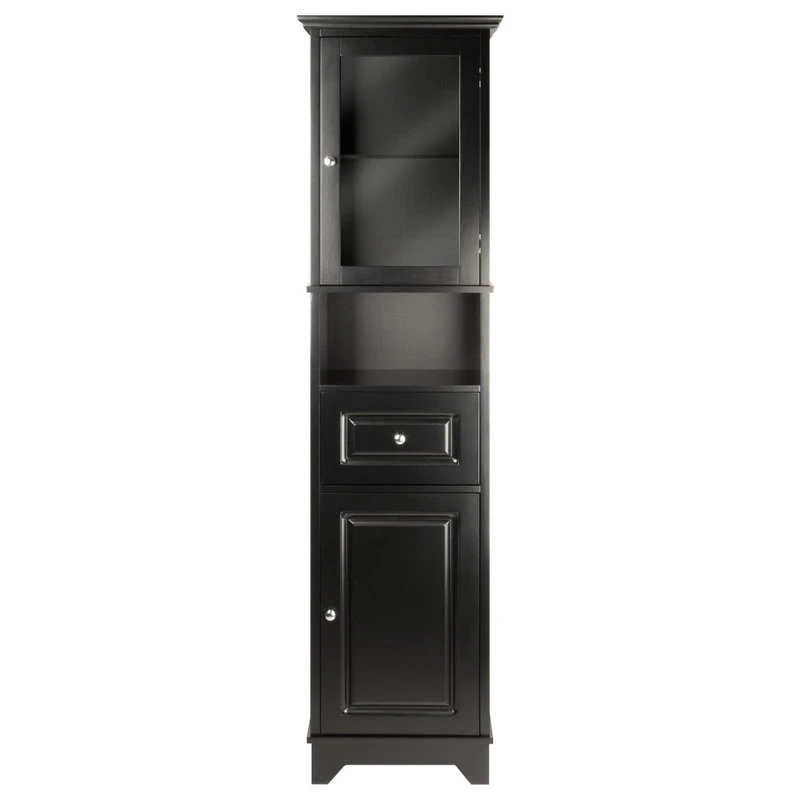 Alps Cabinet is a perfect addition to your kitchen, dining room, or even bathroom. Plenty of storage space with top section featuring a glass door that opens to one adjustable shelf to show your valuables or essentials. Cabinet storage size 14″W x 11″D x 22.4″H. An open cubed space below the cabinet is 14″W x 11.6″D x 8.5″H. One drawer with inside dimensions 13″W x 9″D x 6.3″H. The enclosed bottom cabinet with an adjustable shelf, 14″W x 11″D x 22.4″H. Combination of solid and composite wood in black finish. Assembly required.Features